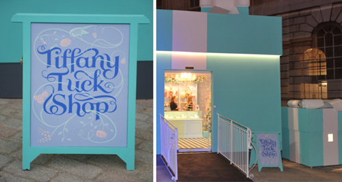 Kate Forrester was asked by the New York design department of Tiffany’s to create some of her gorgeous hand drawn lettering for window displays and signage in Japan London and the flagship store in New York. These designs were then used to decorate each store in vinyl, cut paper and also hand painted on to a sandwich board for the London ‘tuck shop’.