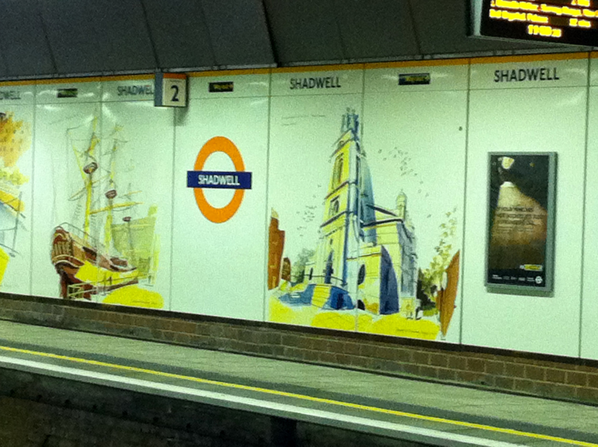 On a recent trip on the East London line of London overground service we spotted these lovely illustrations by our Sarah McMenemy. Sarah was commissioned by London Underground to produce a series of illustrations as part of the regeneration of the transport links. Sarah said it was important to convey the cultural, architectural and social diversity of the area. Local landmarks as diverse as pubs, market stalls at Watney Street market and lock-up garages under the arches of the DLR line to a majestic Hawksmoor church and elegant tall ships in dock were printed onto two metre high enamel panels that now line the platforms at the station. The local school, parks, The Thames, sailing club, rolling bascule bridge all add to the interesting mix of features that this historic area of the London Docks has to offer. Now due to Crossrail and the flow of visitors to the Olympic village this permanent installation is getting greater exposure than ever.