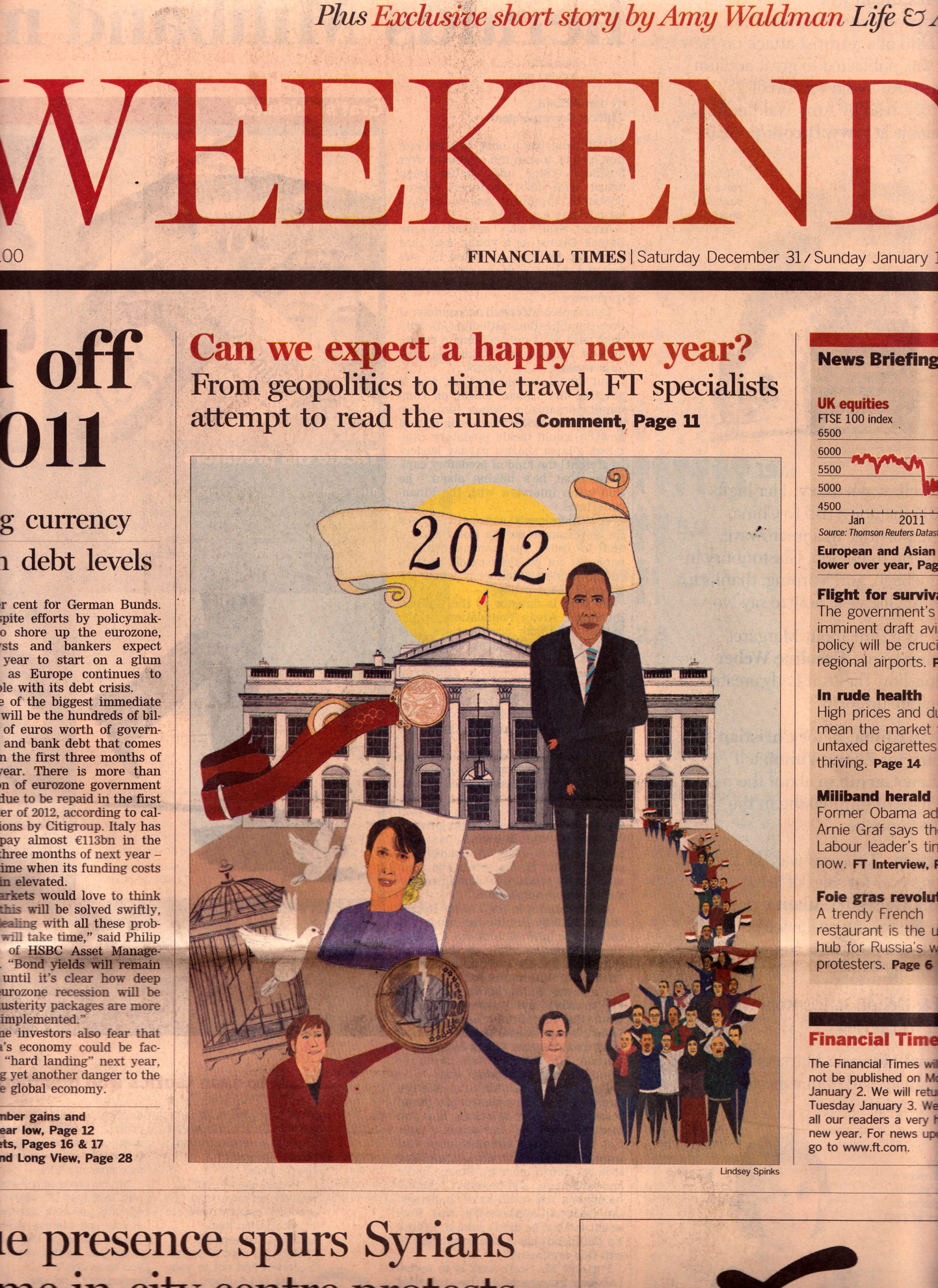 One of our Startworks artists Lindsey Spinks was asked by the FT to produce an illustration based on various predictions for the new year 2012. Lindsey created this brilliant illustration which was used on the cover and inside the paper too. A tricky brief to pull together so many elements, we think it is a great success, well done Lindsey!