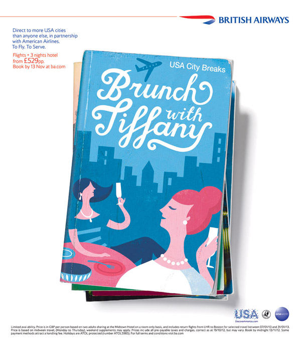 Lucy Davey was recently asked by advertising agency BBH to work on this great ad for British Airways. Lucy’s bold flat colour and gorgeous type made her the perfect choice for these city break guide books used in the adverts. It’s certainly making us tempted to jet off for a glass of bubbly and a city break!