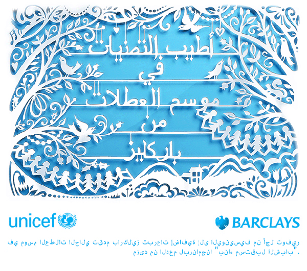 Kate Forrester was asked to produce a set of Christmas greetings cards for Barclays bank to ‘display a seasonal message in a beautiful way by using strongly lit paper silhouttes’. Barclays wanted to send their Christmas message to all of their international clients, so Kate was asked to turn her lettering hand to several different languages as well. She can now say ‘Best wishes for the holiday season from Barclays’ in over 10 languages!