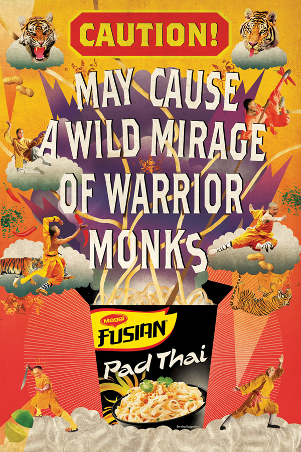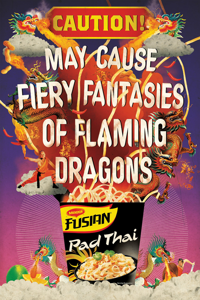 Our latest addition to The Artworks, Laurindo Feliciano has blown us away with his first job for Publicis Mojo in Sydney. Laurindo was selected to illustrate the new ‘CAUTION’ campaign for Nestle’s product MAGGI Fusian Pad Thai. Laurindo’s surreal and imaginative illustration made him the perfect choice to help create this stand-out campaign. Michael Dole, Creative Director of Publicis Mojo, Sydney: “The guys have worked really hard to create a great and unusual campaign for our target market. We were incredibly lucky to work with Laurindo, who added his own brilliant ideas and imagination to bring the concept to life. God only knows what goes on in his head.” Well done Laurindo, we can’t wait to see what you do next!