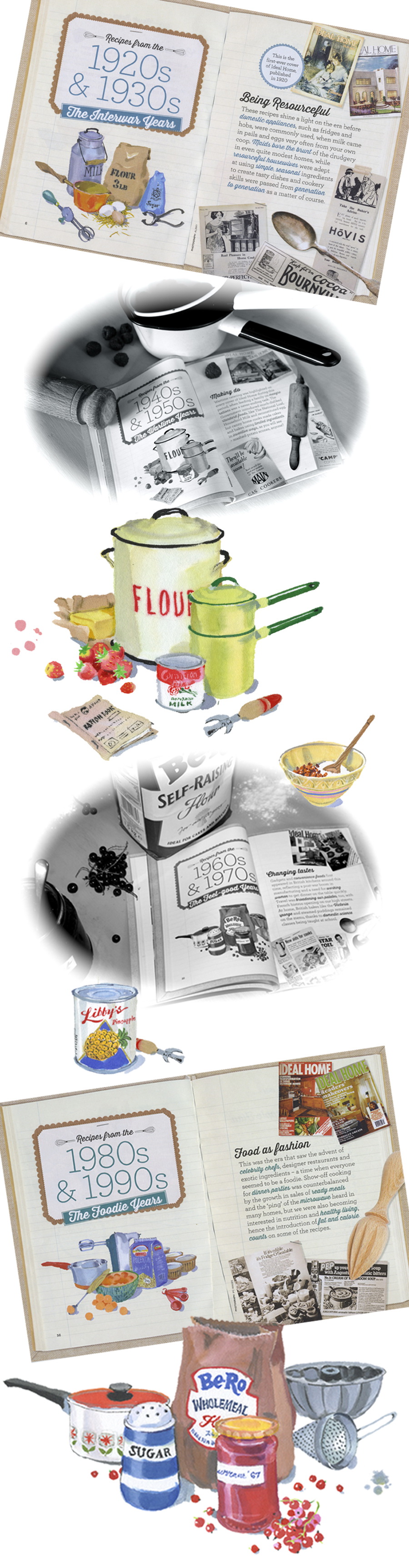 A little booklet of “Classic Bakes’ illustrated by Mary Woodin comes with October’s Ideal Home magazine. Mary was asked to illustrate classic recipes from the magazine’s archives dating right back to 1920. A keen cook, Mary was delighted to have an excuse to dig out her battered rolling pin and vintage whisk to create these evocative illustrations!