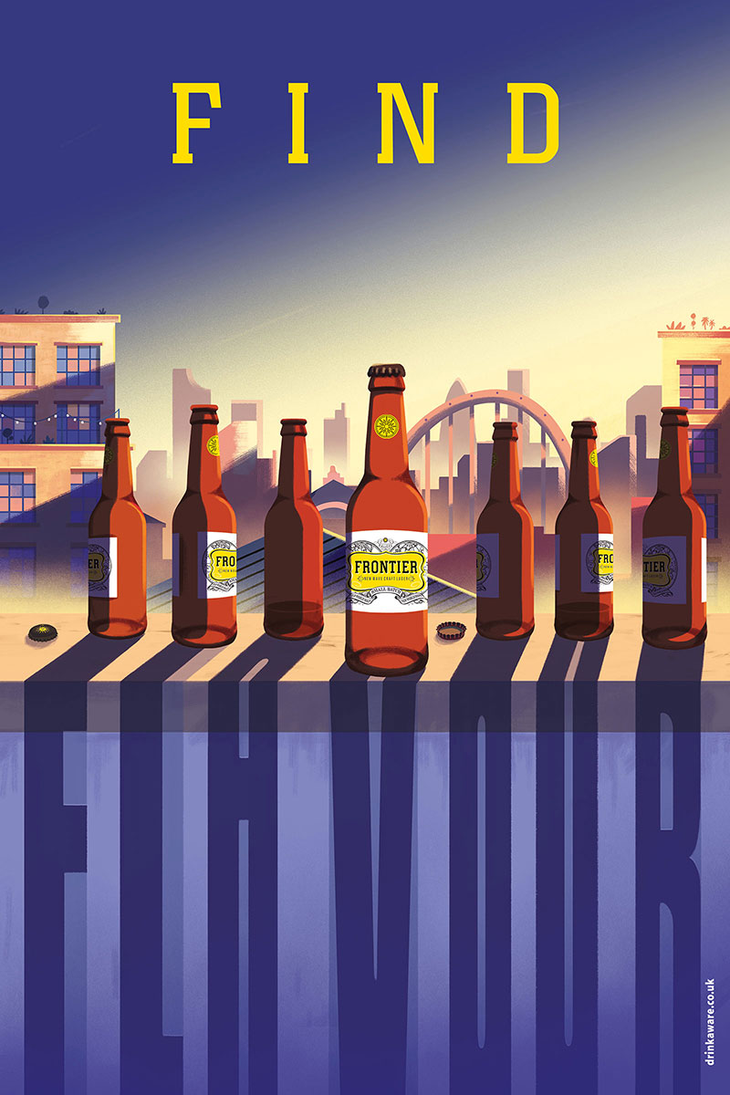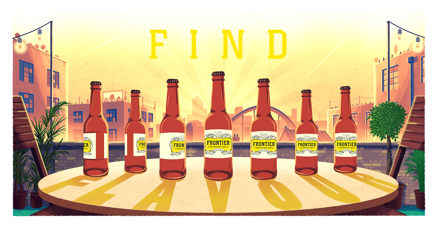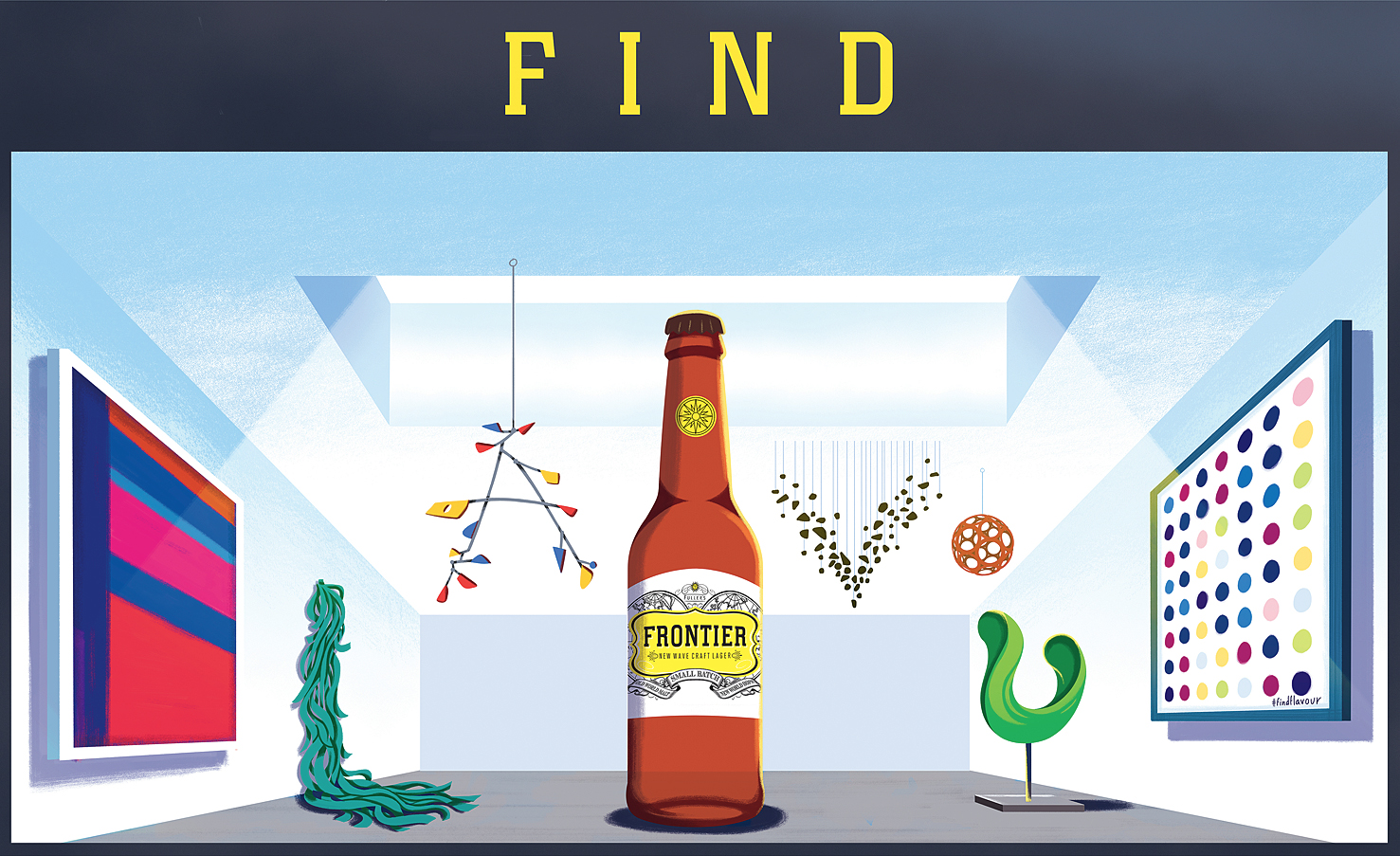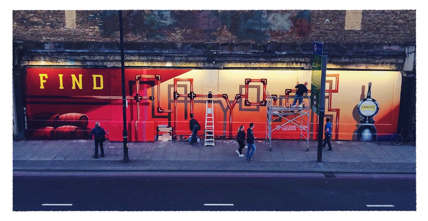Tom Cole has been busy illustrating a stunning campaign promoting Frontier, a new craft lager. His vibrant murals can currently be seen around East London. The campaign plays around the idea of discovering new tastes by inviting you to “find” the flavour.