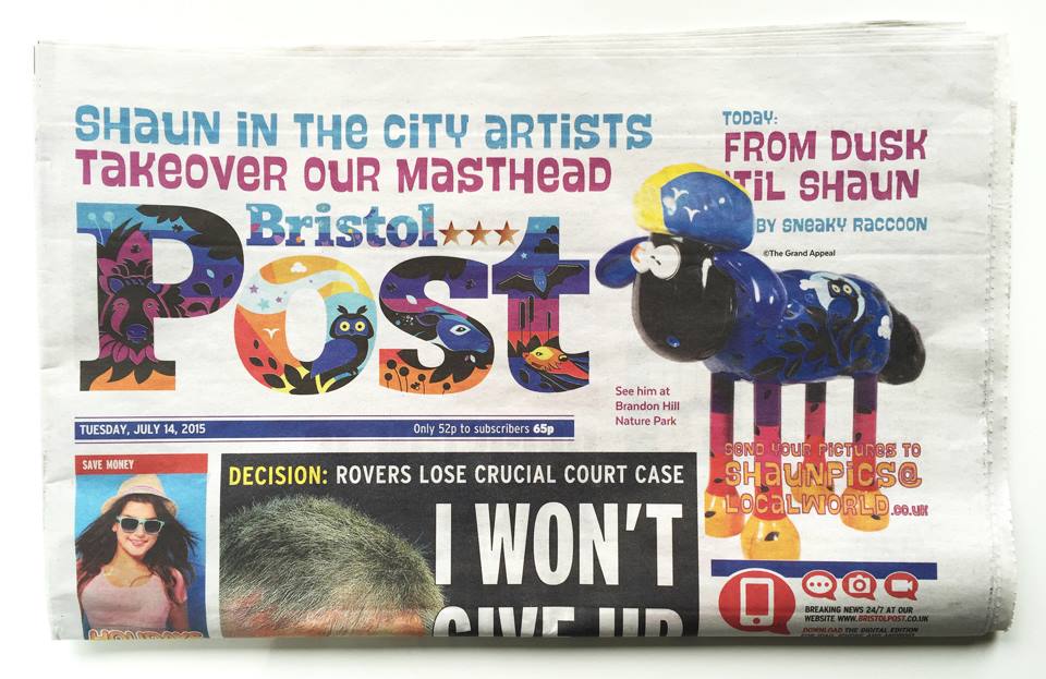Recently Sneaky Raccoon took part in the Shaun in the City charity event organised by Wallace & Gromit’s Children’s Foundation. Her illustrations adorned a Shaun the Sheep which was then displayed in Bristol. Leading on from this, Sneaky Racoon was given the opportunity to redesign the masthead of The Bristol Post newspaper. The design is based on the original painted artwork of the ‘From Dusk till’ Shaun’ sculpture design for The Grand Appeal’s
