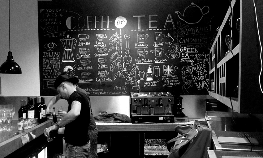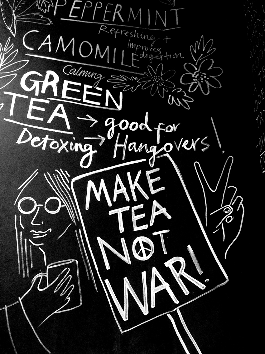 Coinciding with Open House London, Aurelia was asked to spend a day livening up McCann’s drinks station. Armed with chalk pens and fuelled by coffee, Aurelia created a light hearted visual scribble about tea and coffee. Her beautiful illustrations create a lively and exciting space for people to enjoy their warm beverages in.