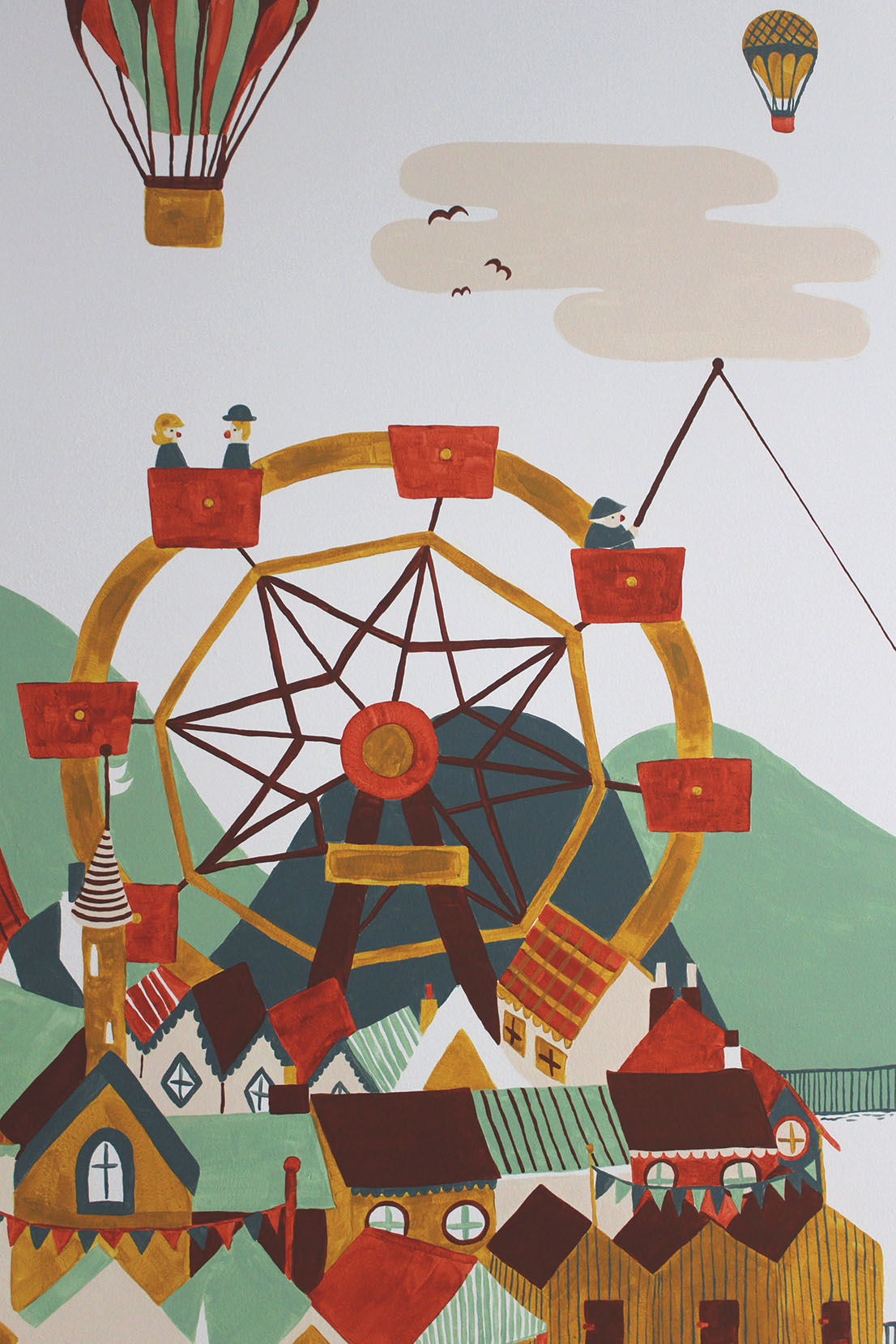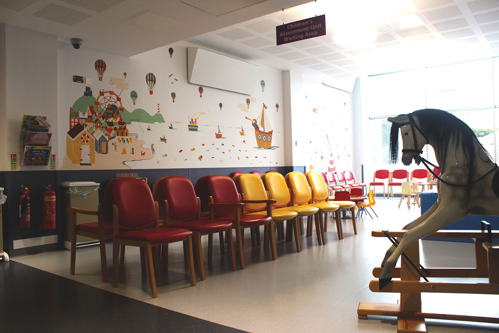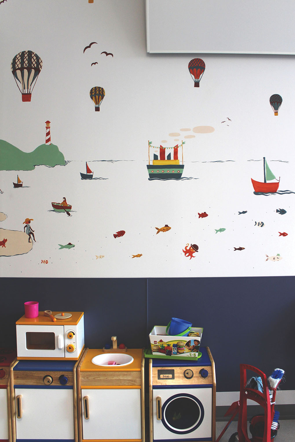 Dawn Elizabeth was commissioned by Buckland Hospital in Dover to design and decorate the childrens’ unit in the new hospital building. The project was funded by the NHS Arts Trust. Dawn was asked to design a sea-side themed mural with a calm feel for the parents but with fun features for the kids to enjoy. The hospital finished the room by adding chairs and toys matching the colours of the mural. Scattered with lovely wooden toys and vintage rocking horses, the waiting room is now a bright and lively space.