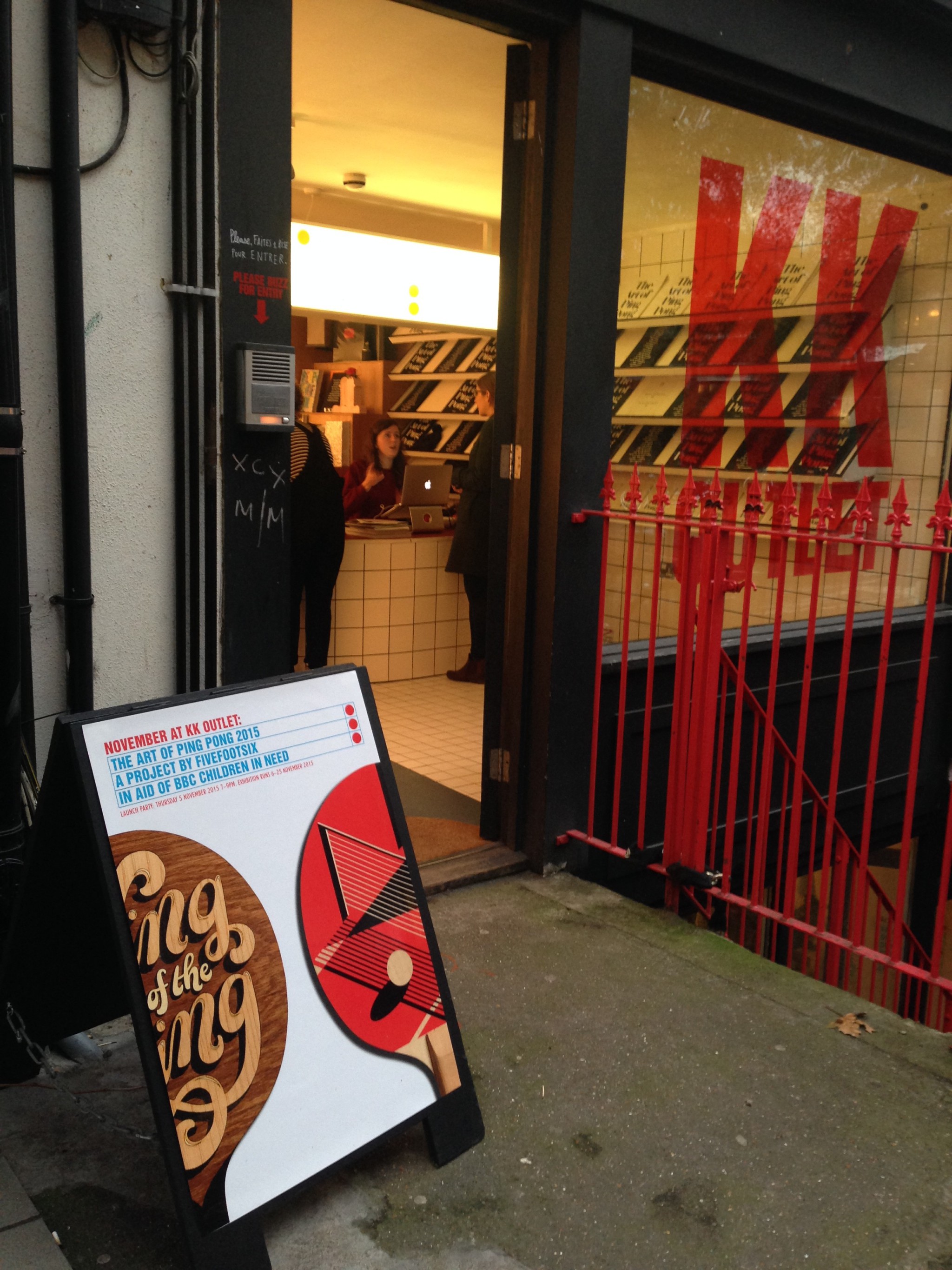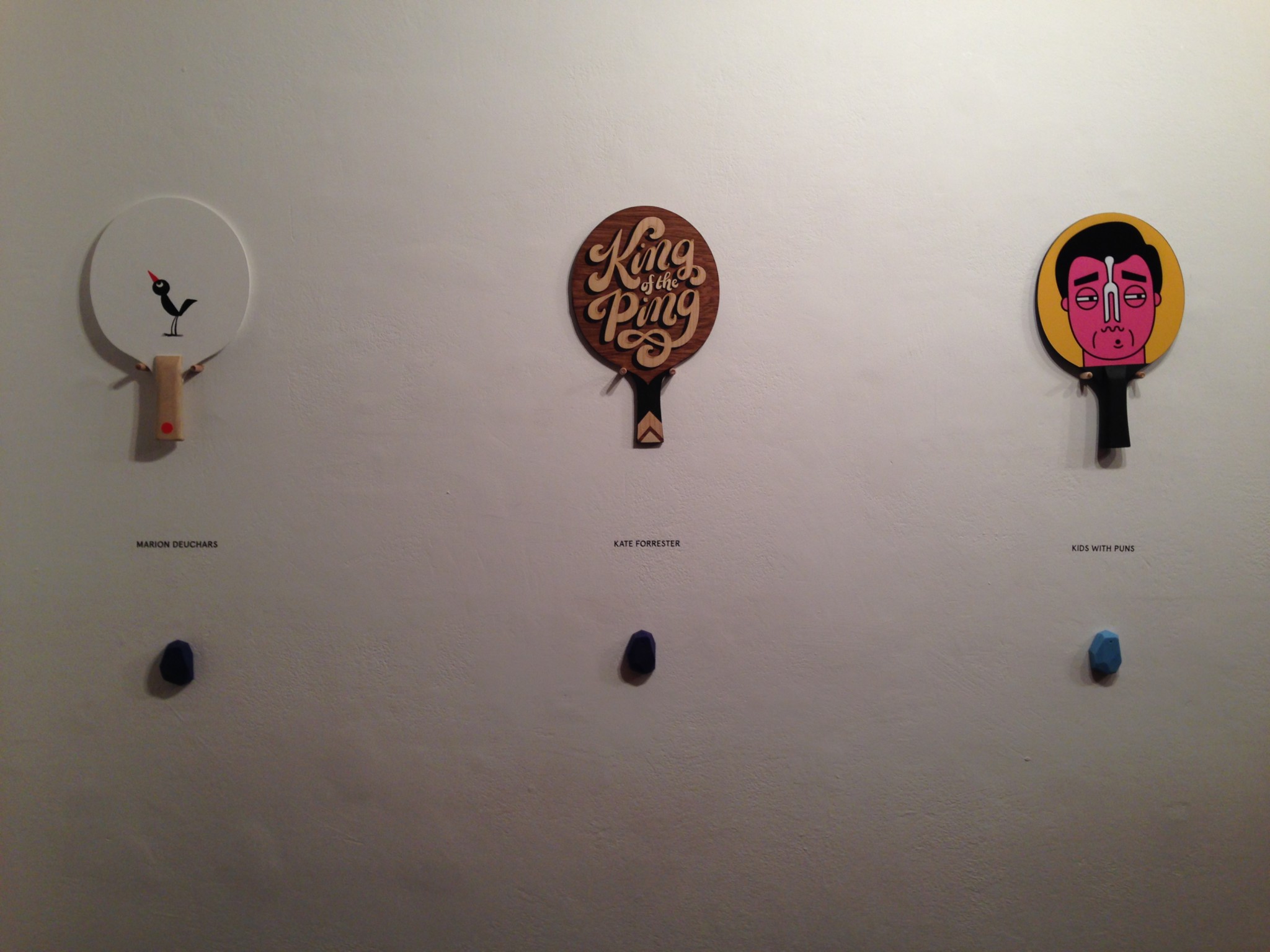 The Art of Ping Pong 2015 is on display at KK Outlet in Hoxton Square. The exhibition shows a collection of wonderfully illustrated ping pong bats, which will be auctioned to raise money for BBC Children in Need. Amongst the collection was a wonderful ping pong paddle illustrated with a stunning design by Kate Forrester. Kate worked with laser cutters to create a beautiful wood in lay design featuring her beautiful typography ‘King of the Ping’! It was great to see Kate’s work, and very exciting to see her new experiments with wood!