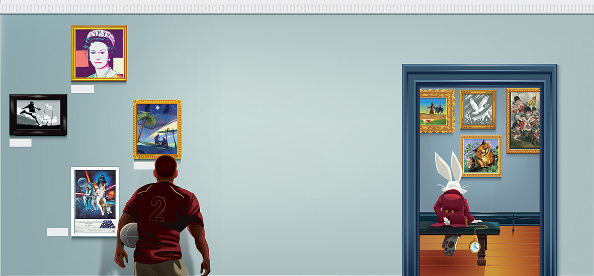 Rob Ball worked with Supple Studio for the Royal mail to create a series of illustrations which celebrate The Royal Mail Year Pack. Rob’s images showcase all the official stamps issued in 2015. Rob created a gallery with characters from the stamps in attendance, the White Rabbit having pride of place on the cover.