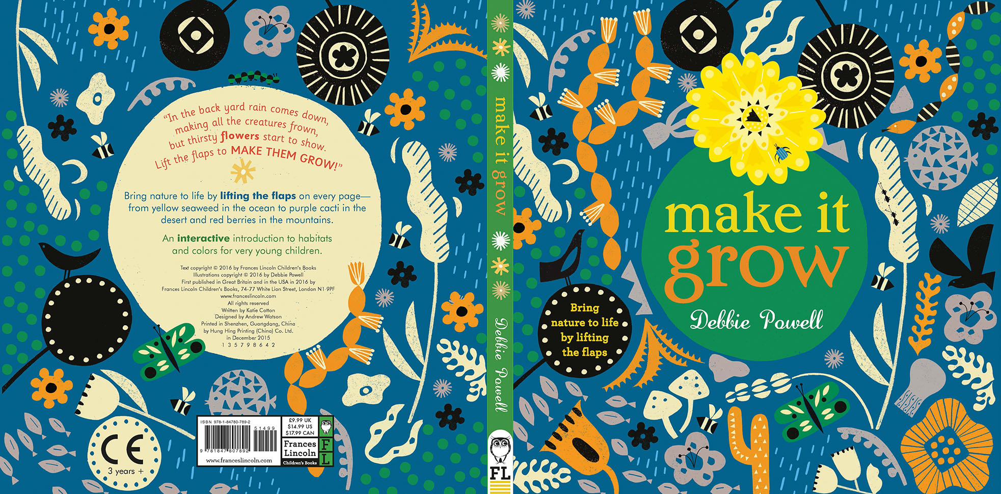 Debbie Powell has created an absolutely stunning interactive children’s book ‘Make it Grow’, published by Francis Lincoln. Every page is bursting with Debbie’s bright and beautiful scenes made from her patterns. Each page features hidden flaps to reveal bursts of colour and new plants growing. The book introduces the reader to how and were plants grow – from the flowers in the backyard, to berries growing in the mountains. This stylish and playful book will appeal to very young children but is also a visual feast for adults too!