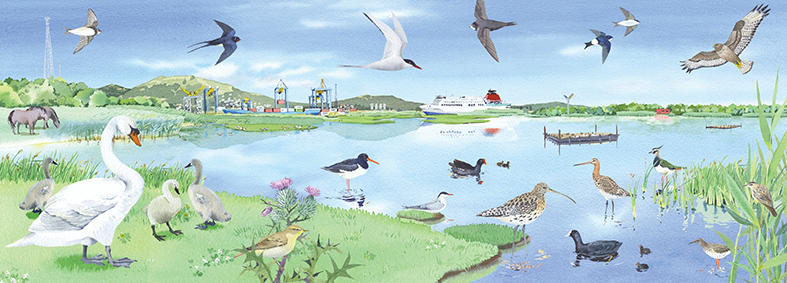 Mary Woodin was asked to create these two illustrations for the RSPB to show the different birds and wildlife at Belfast Lough throughout the different seasons. The illustrations were used at a large scale so that they could be used to identify the different birds from the viewing windows. Mary’s stunning watercolours were perfect to show the subtle seasonal changes in the landscape as well as the technical accuracies of the various species.