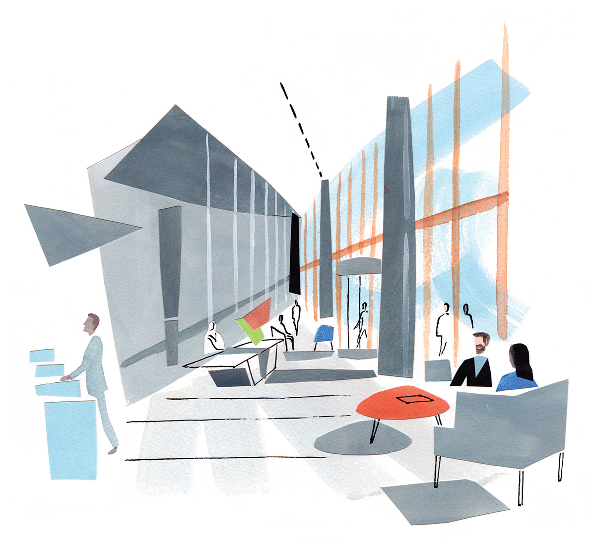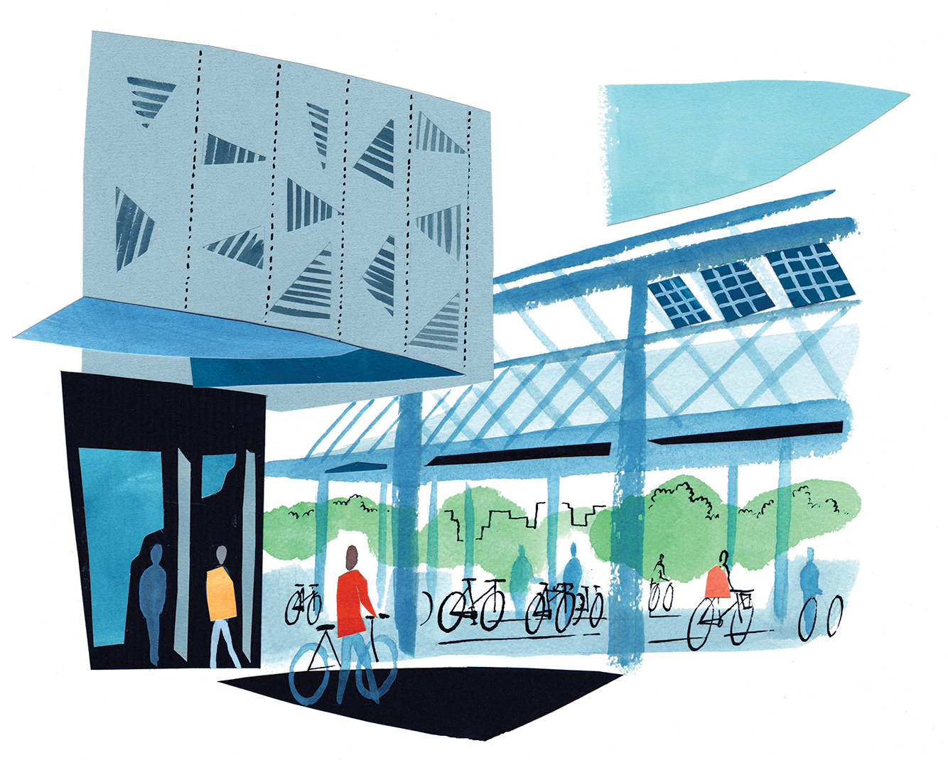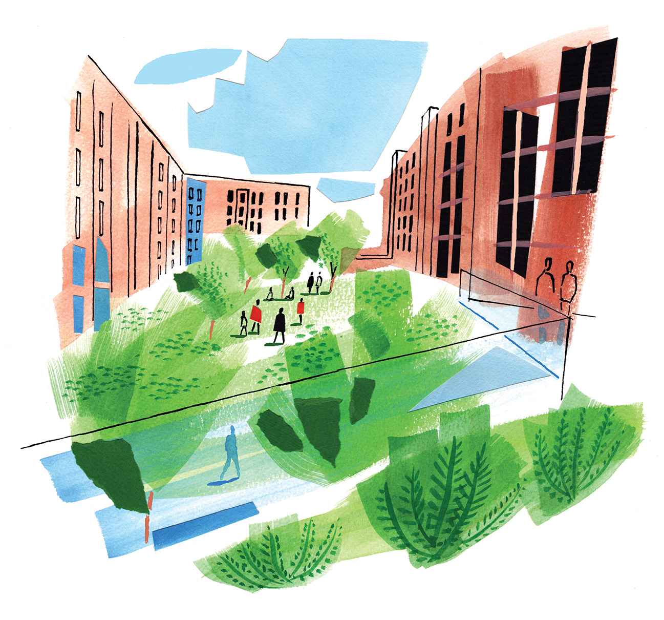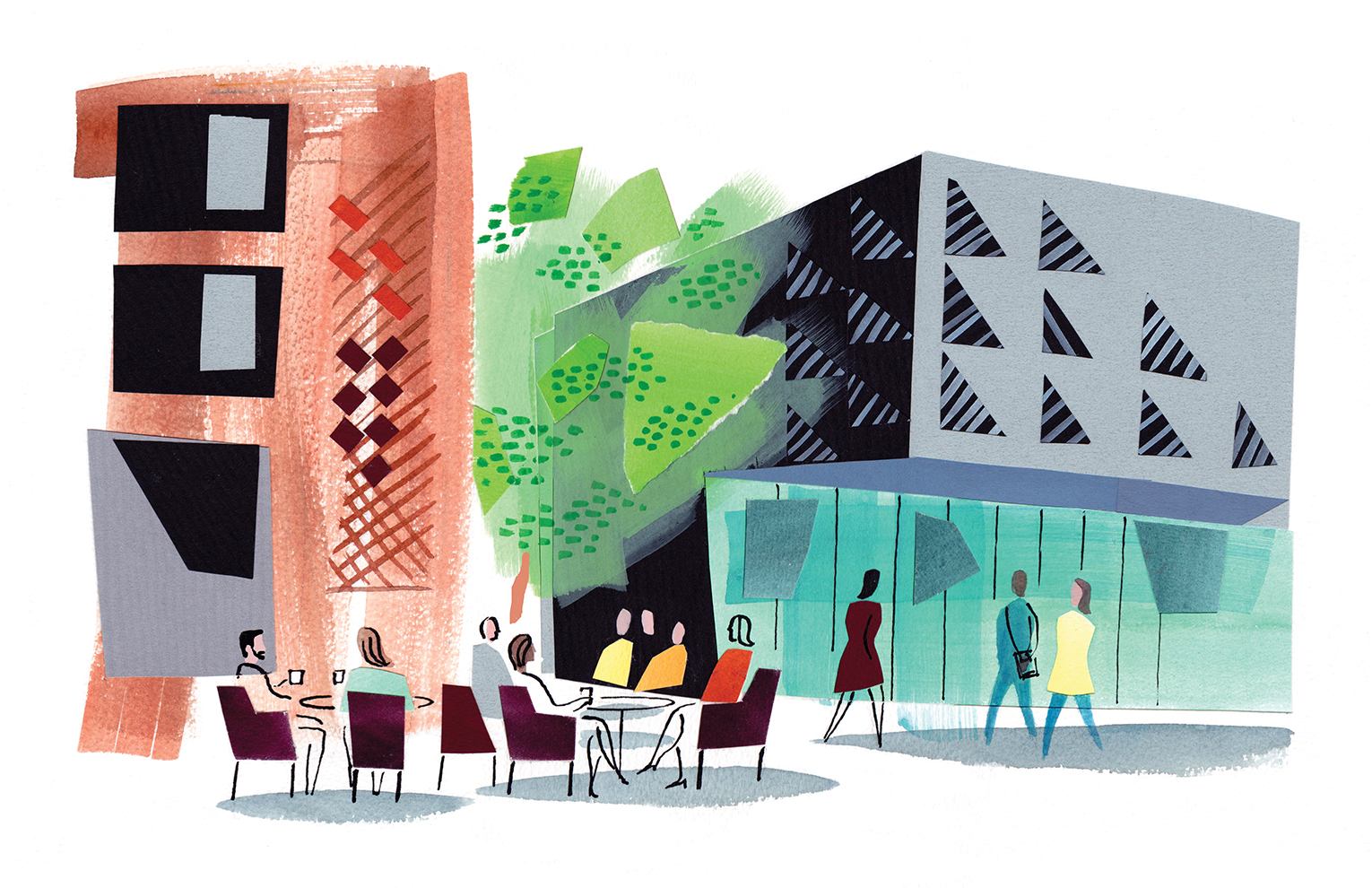 Sarah has been asked, by Silk Pearce, to create a set of images to visualise the coming new development around the newly built rail station in the North of Cambridge. Full of energy and life, they convey the dynamic atmosphere of the city’s newest live/work quarter.