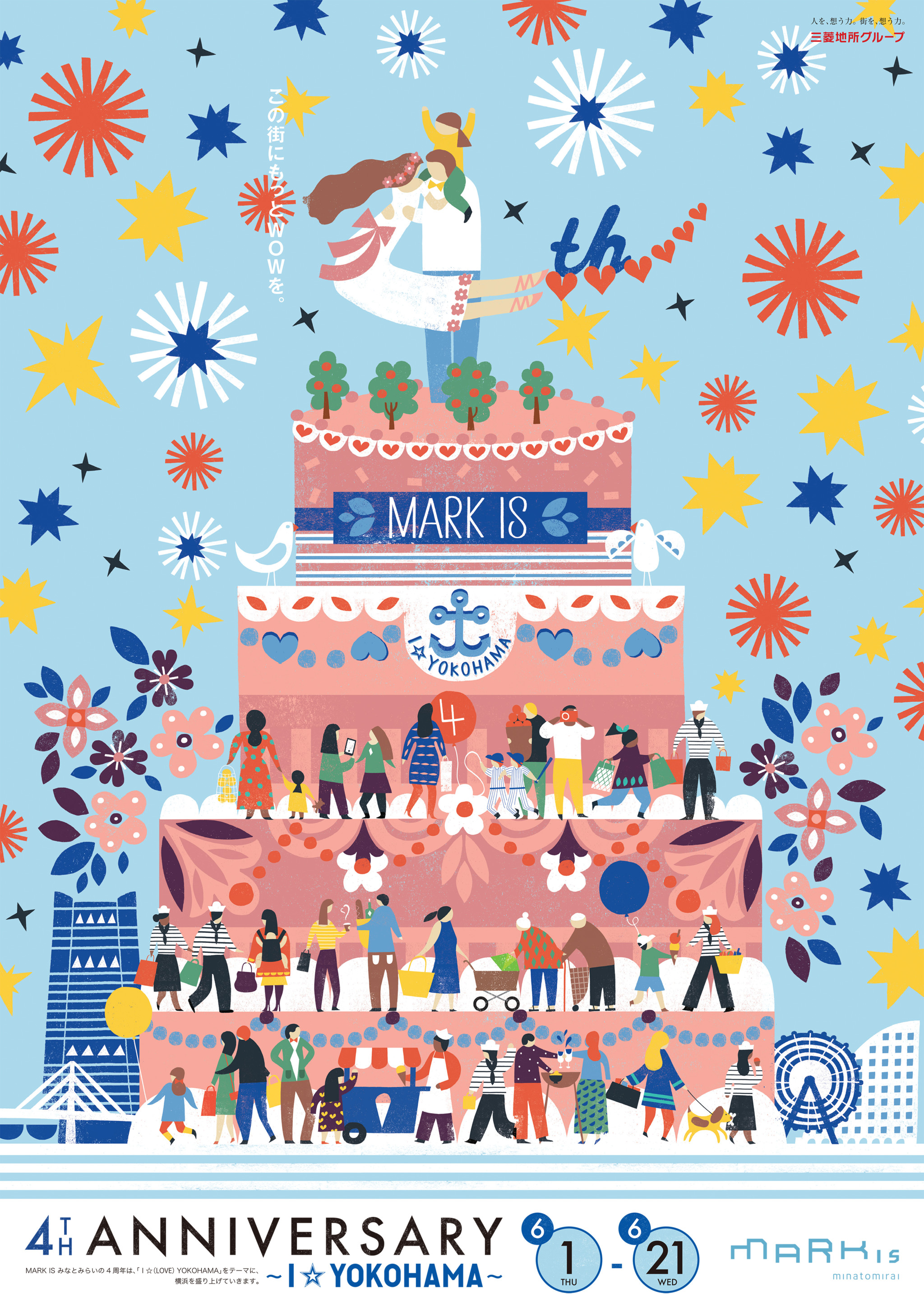 MARK IS is a shopping mall located in Minato Mirai , Yokohama, Japan. The image is for their 4th anniversary, so the main of the image is a birthday cake with a couple making the number ‘4’ with their bodies. MARK IS requested Debbie to decorate the cake with people who come to their shopping building and to put some landmarks of Yokohama in the image. There were many things to be drawn in the image, and Debbie did it perfectly!