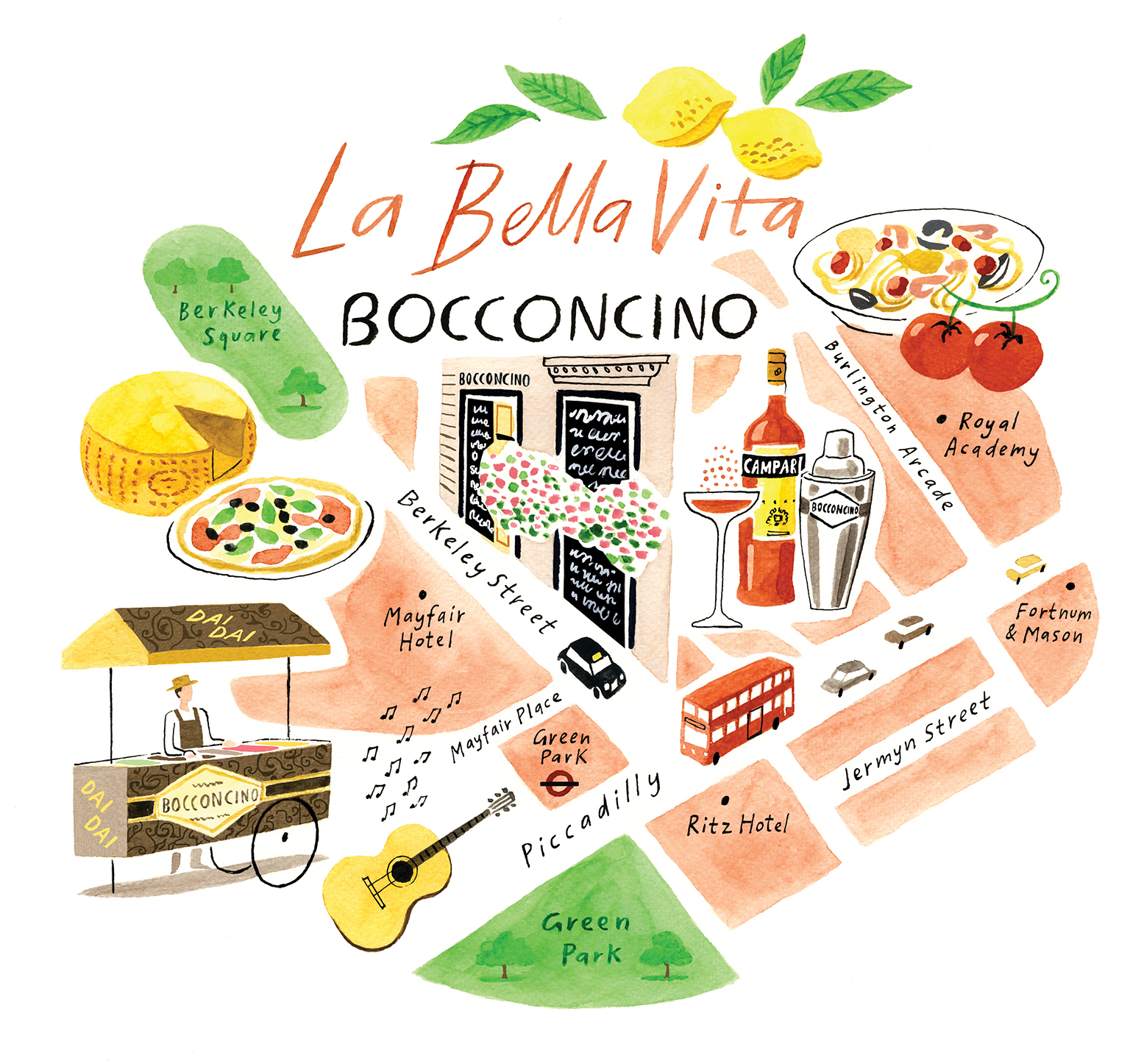 Italian restaurant, Bocconcino, based in London’s Mayfair recently commissioned Sarah McMenemy to capture the flavour of their summer season in this charming illustration. Sarah approached the brief by incorporating iconic ingredients from Italian cooking into a map of London’s West End. Looks delicious!