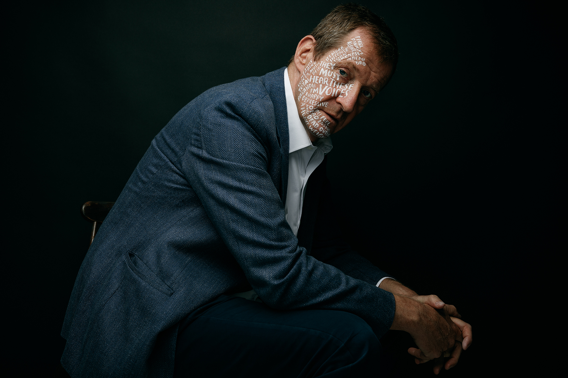 Kate hand lettered people’s own experiences with mental health onto their faces. The charity has released a series of 17 portraits of regular people and some well known faces such as Alastair Campbell, Sue Perkins, Anna Richardson, Bryony Gordon, and Jordan Stephen, all people who have been brave enough to talk about their experiences with mental health problems of all kinds.