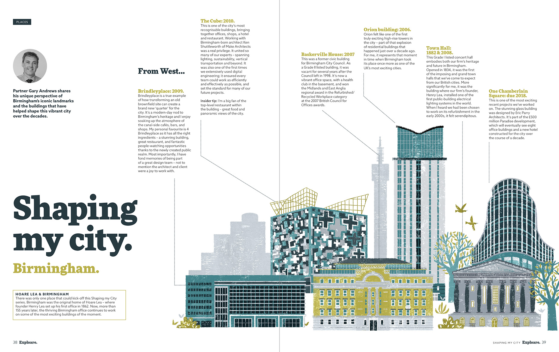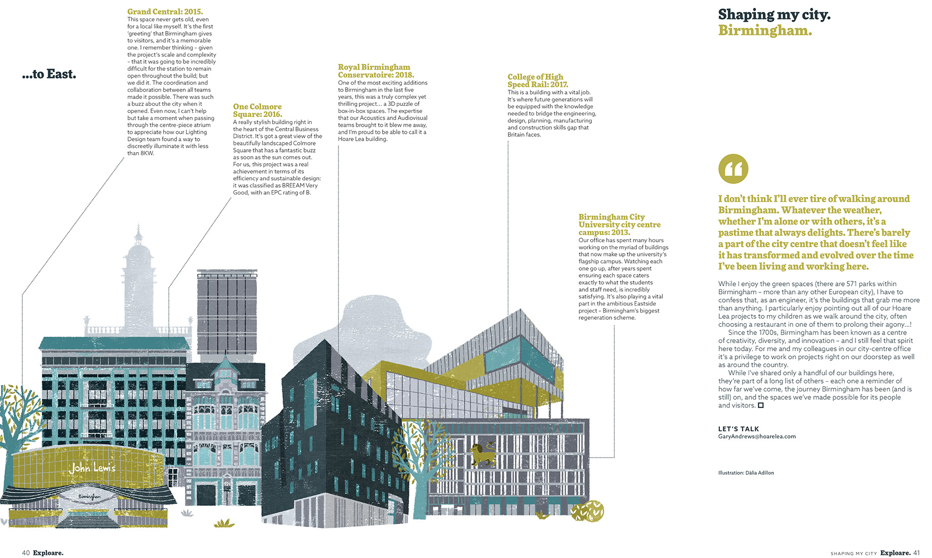 The brief was to create a fictional skyline made up of each project – split evenly over two spreads of the magazine. They wanted the illustration to incorporate the silhouettes of other Birmingham landmarks in the background and for the buildings to be juxtaposed against each other.