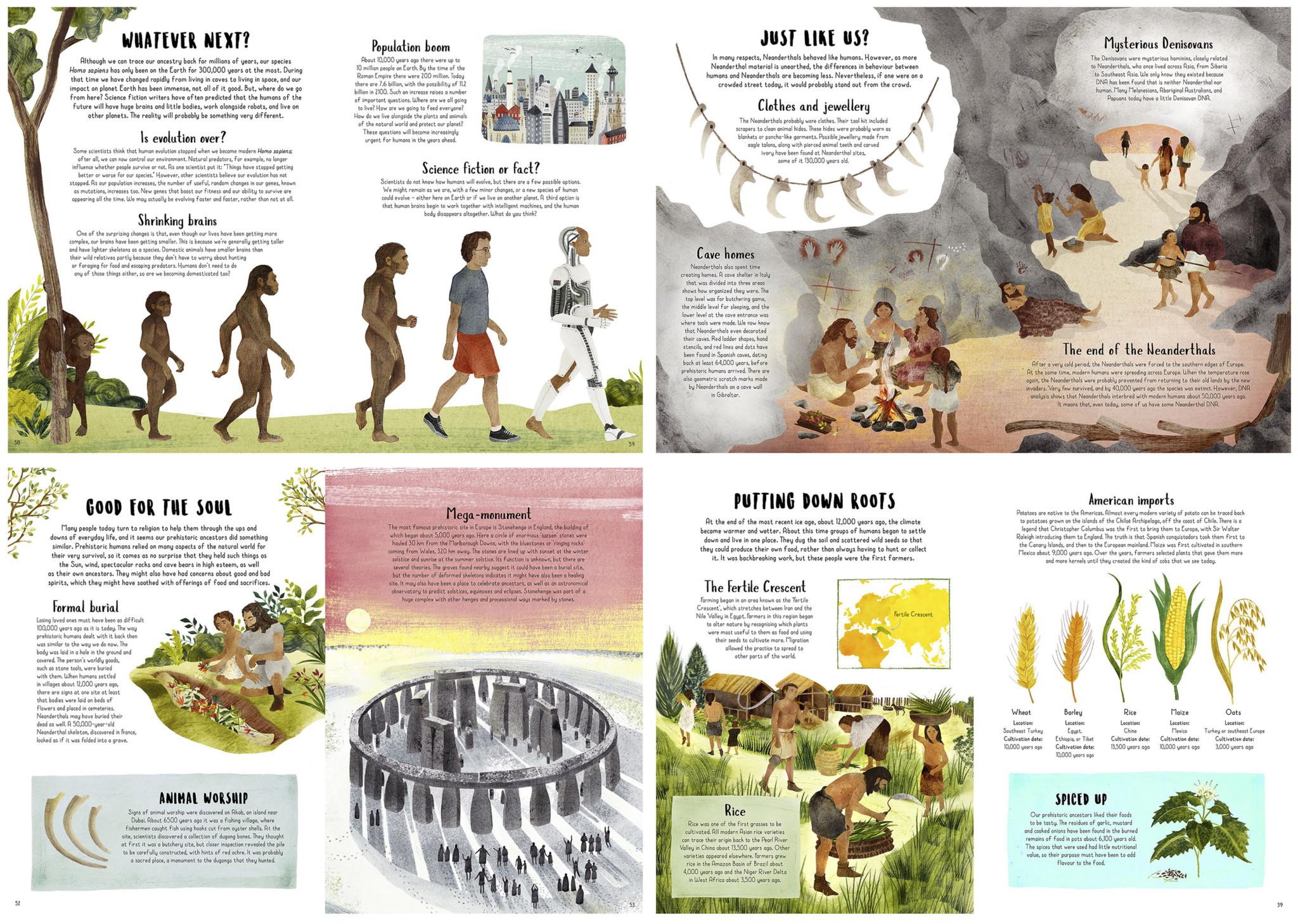 When approaching When We Became Humans, Hannah “wanted the illustrations to be earthy and textural throughout – with a grainy, scratchy quality – to give a prehistoric feel”. The colour palette of warm browns, oranges and pinks also added to the ancient, prehistoric feel. Hannah said that it was a test to draw the early human figures anatomically correctly, and she had to do ample research before approaching each scene. That being said, she certainly rose to the challenge – completing a multitude of illustrations depicting everything from prehistoric hunting and gathering, to aspects of modern civilisation. As an artist, it is unsurprising that Hannah’s favourite sections were about human creativity – in particular, she found cave drawings and monuments like Stonehenge mind-bogglingly interesting.
