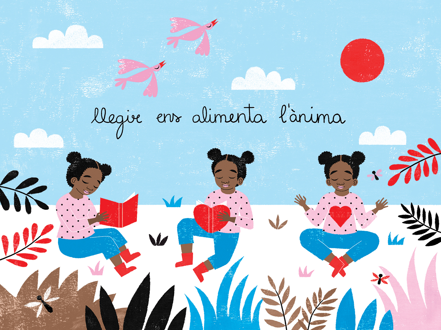 Dàlia started the project as she does normally, working on a colourful pencil drawing. “The first thing I did was to work on a colour sketch, in which a black girl appears reading a book (which turns into a heart) in the middle of nature. In the illustration there is the quotation ‘Nourishing my soul, reading a book’.”