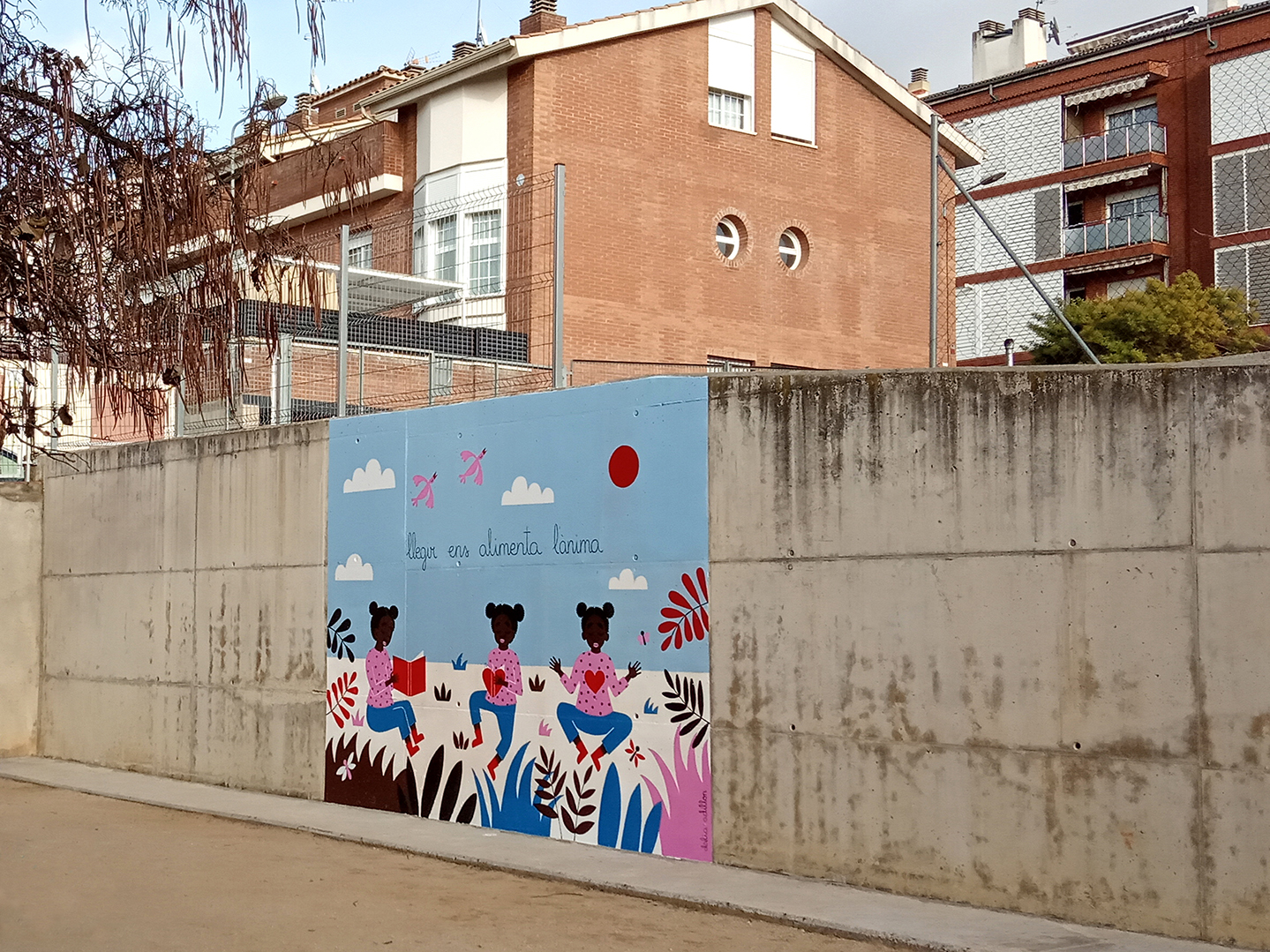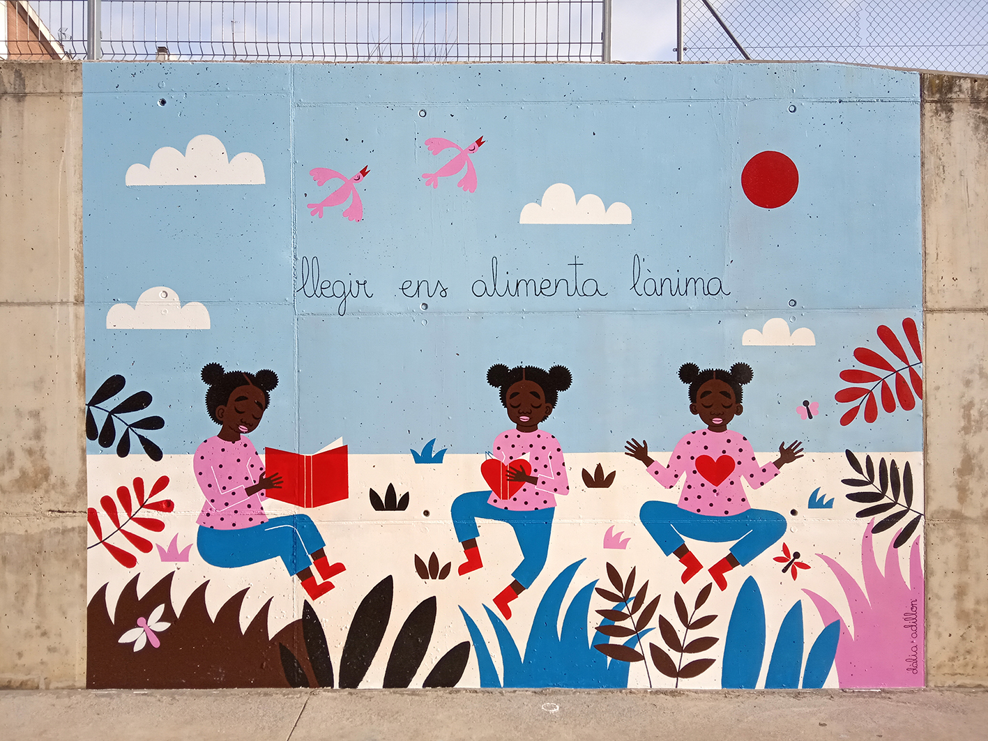 Dàlia Adillon was recently commissioned by Mossen Cinto Verdaguer School in Barcelona to paint a playful and colourful mural that captured the themes of childhood, reading and diversity.