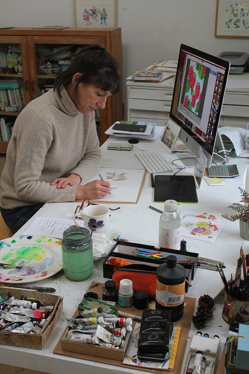I work with good old tubes of watercolour paint, brushes, coloured pencils, pen and ink etc. I simply love the tactile quality of moving colour around on paper. There’s no doubt though, a bit of additional jiggery pokery in photoshop has saved many a piece of artwork. Increasingly I’ll paint separate elements and put them together in photoshop to give me more flexibility with composition and scale.