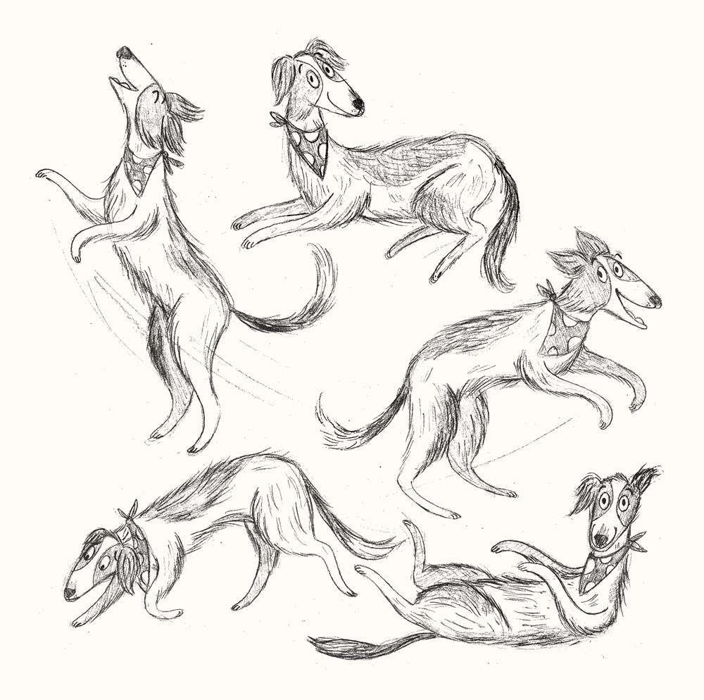 Rachael put a lot of thought into the kind of dog Fidget would be, figuring out exactly which breed best suited the expressive adventurer! You can see from her sketches how her loosened style accentuates Fidget’s hair as we bounds from one scene to the next.