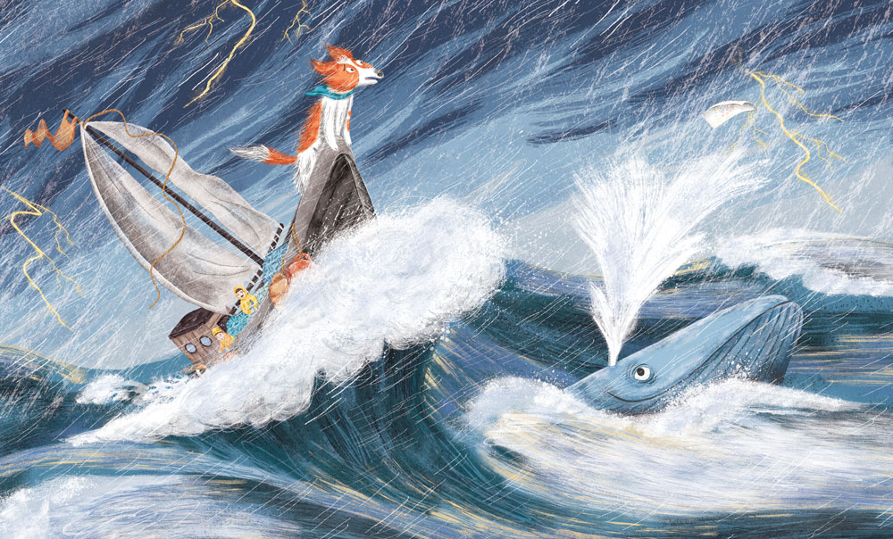“The storm scene is my favourite spread as there is so much energy and layering of texture. I wanted this page to consume the reader in a mixture of fear and fight for Fidget as he battles through the waves.”