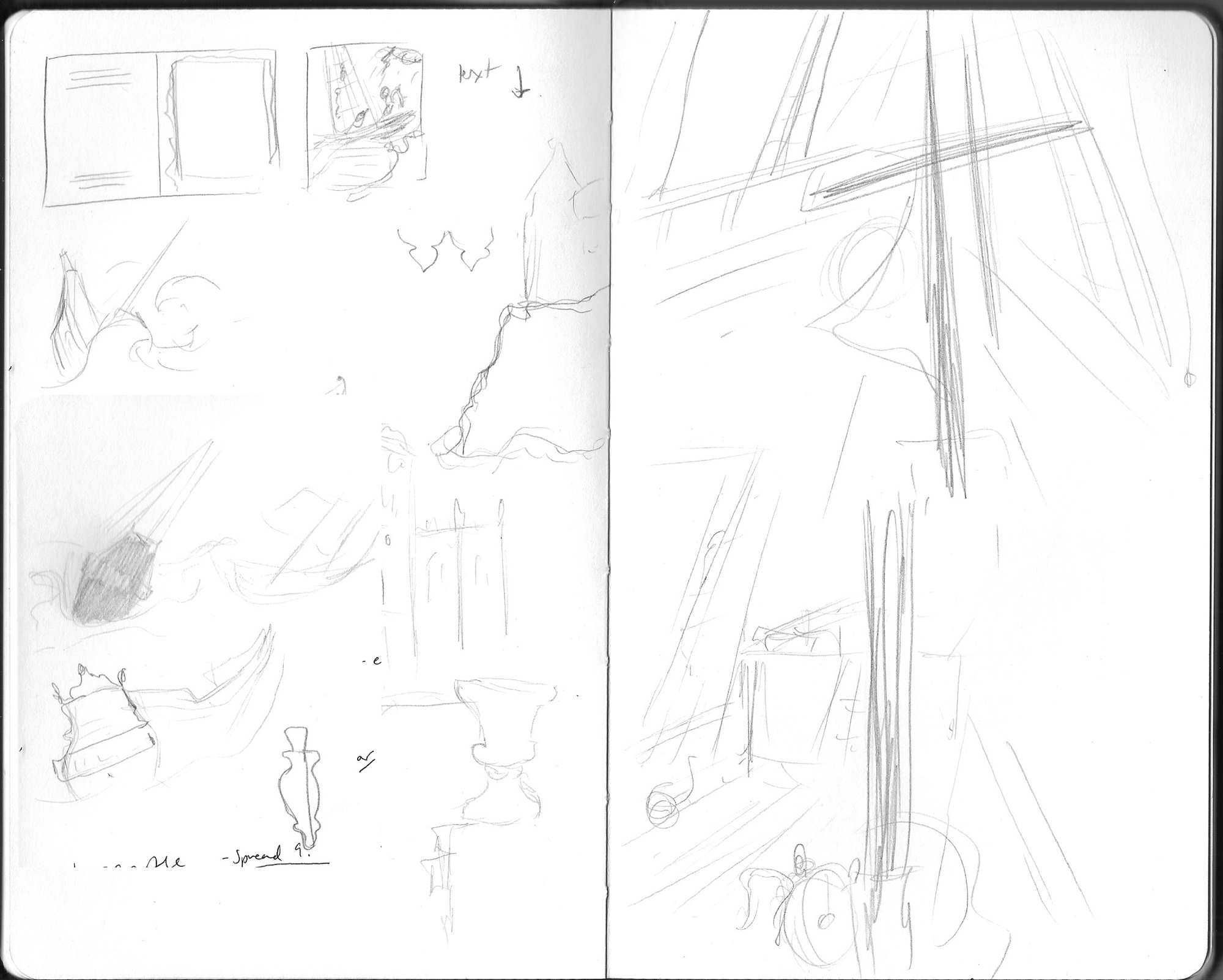 “I draw a very rough shape before working back in to this to add more detail. I’ll draw all of the elements; characters and background scenery and then start playing around with layering them, figuring out what works best.”