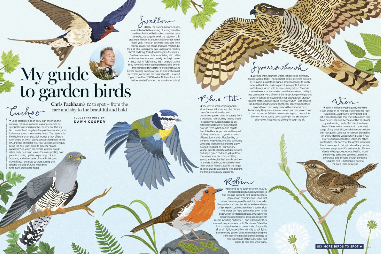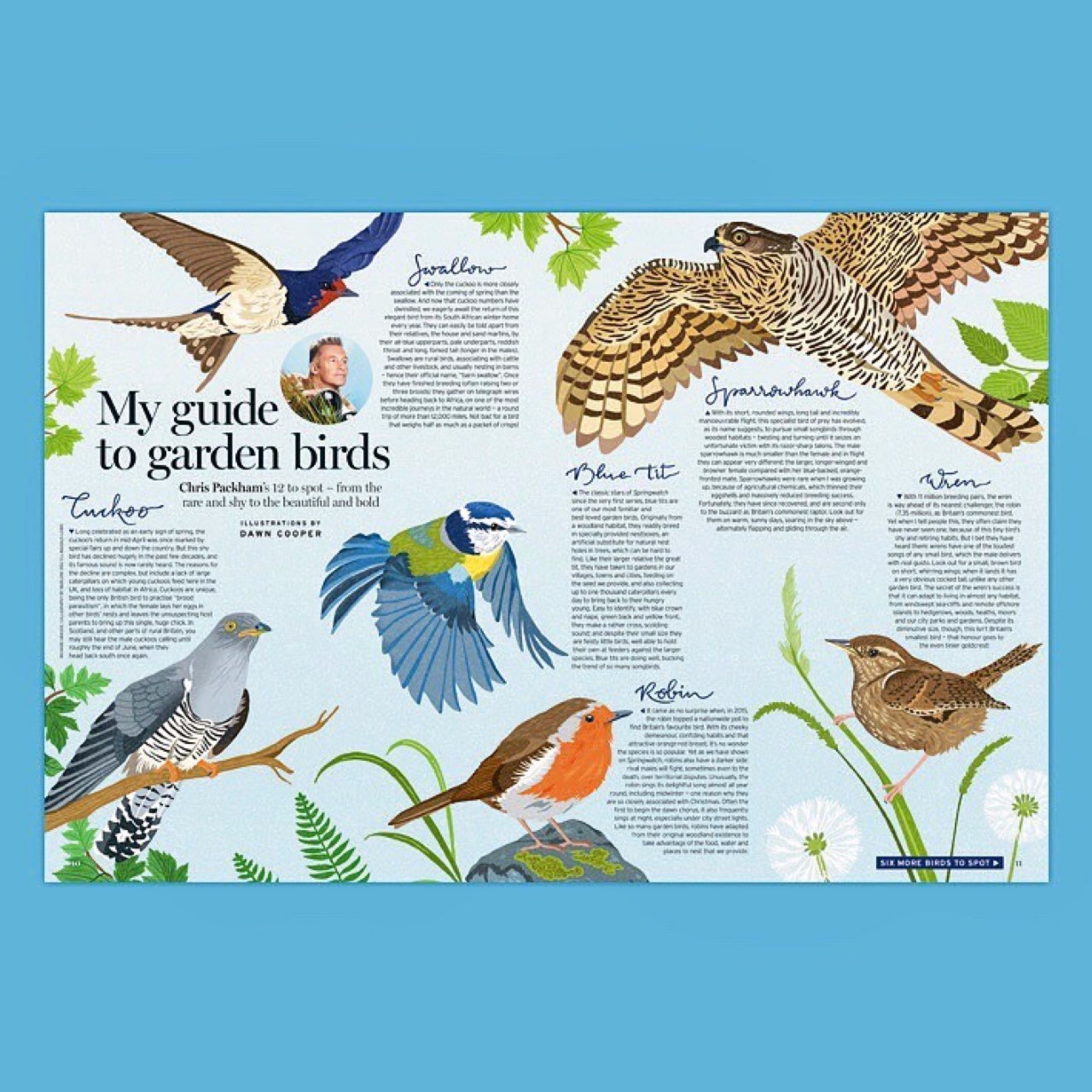 To celebrate the return to the screen of the BBC’s Springwatch, Dawn Cooper has illustrated the perfect bird watching guide for this weeks Radio Times; something to occupy yourself with on those daily exercise walks, adding in Dawn’s words, ” a little brightness into our lives at a less than usual time.”