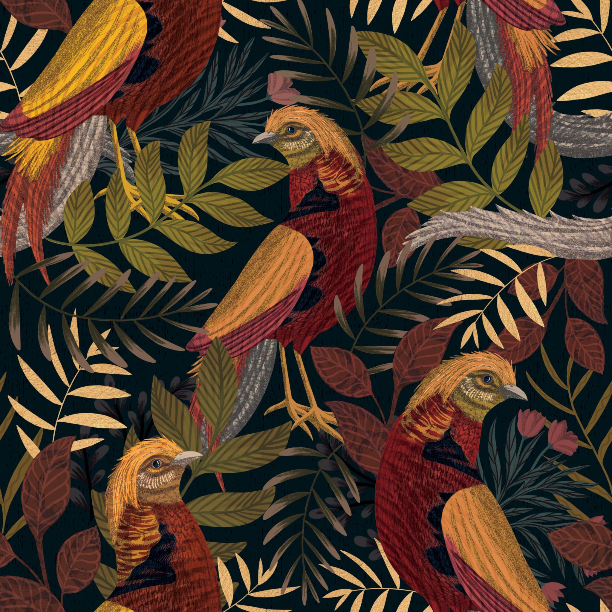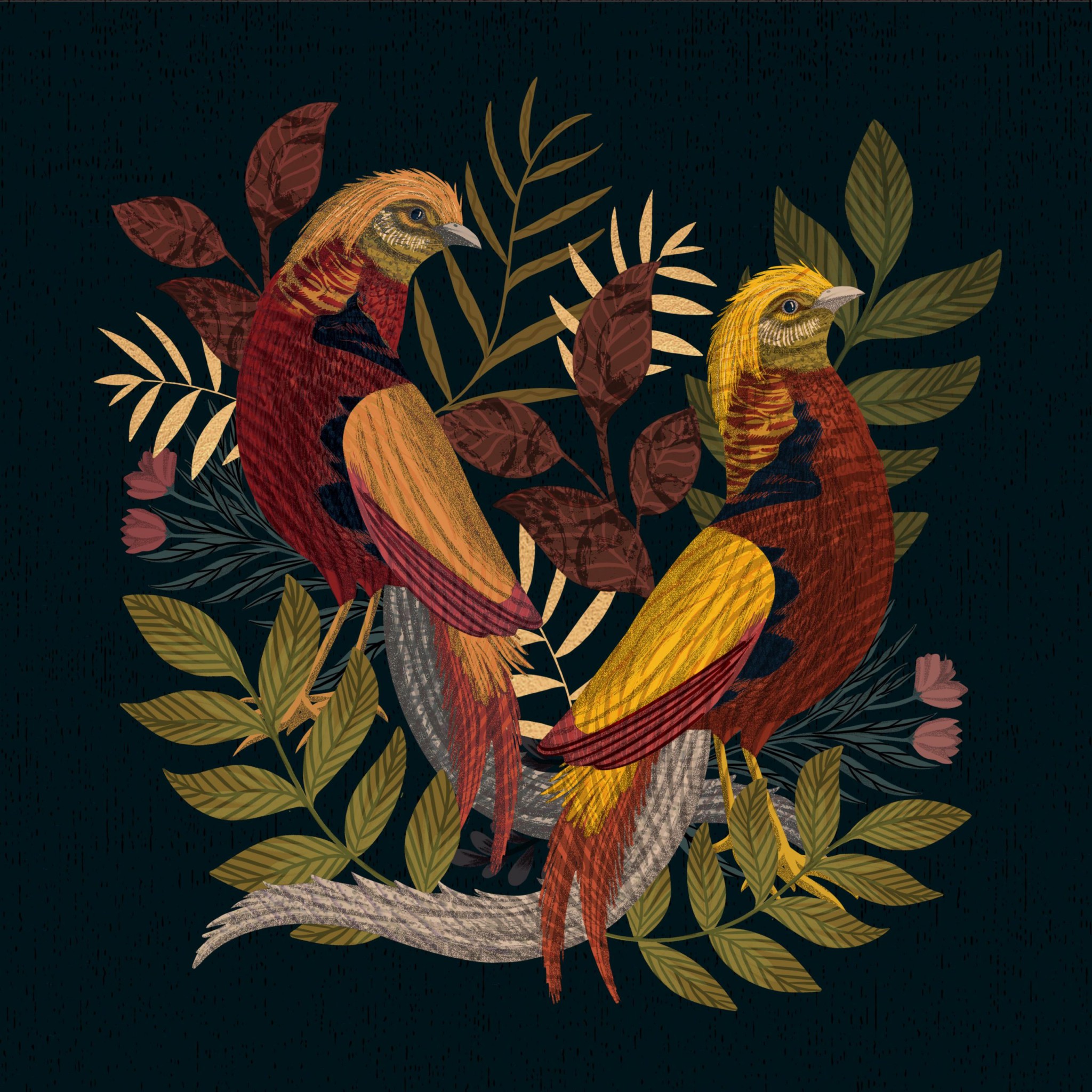 Starting with research on a particular subject (normally exotic birds, animals and plants), Lucy begins to sketch out composition ideas and settles on initial colour palettes, “I think this is a really important and time consuming stage for me and it’s very likely I will spend time at the end also tweaking them”.