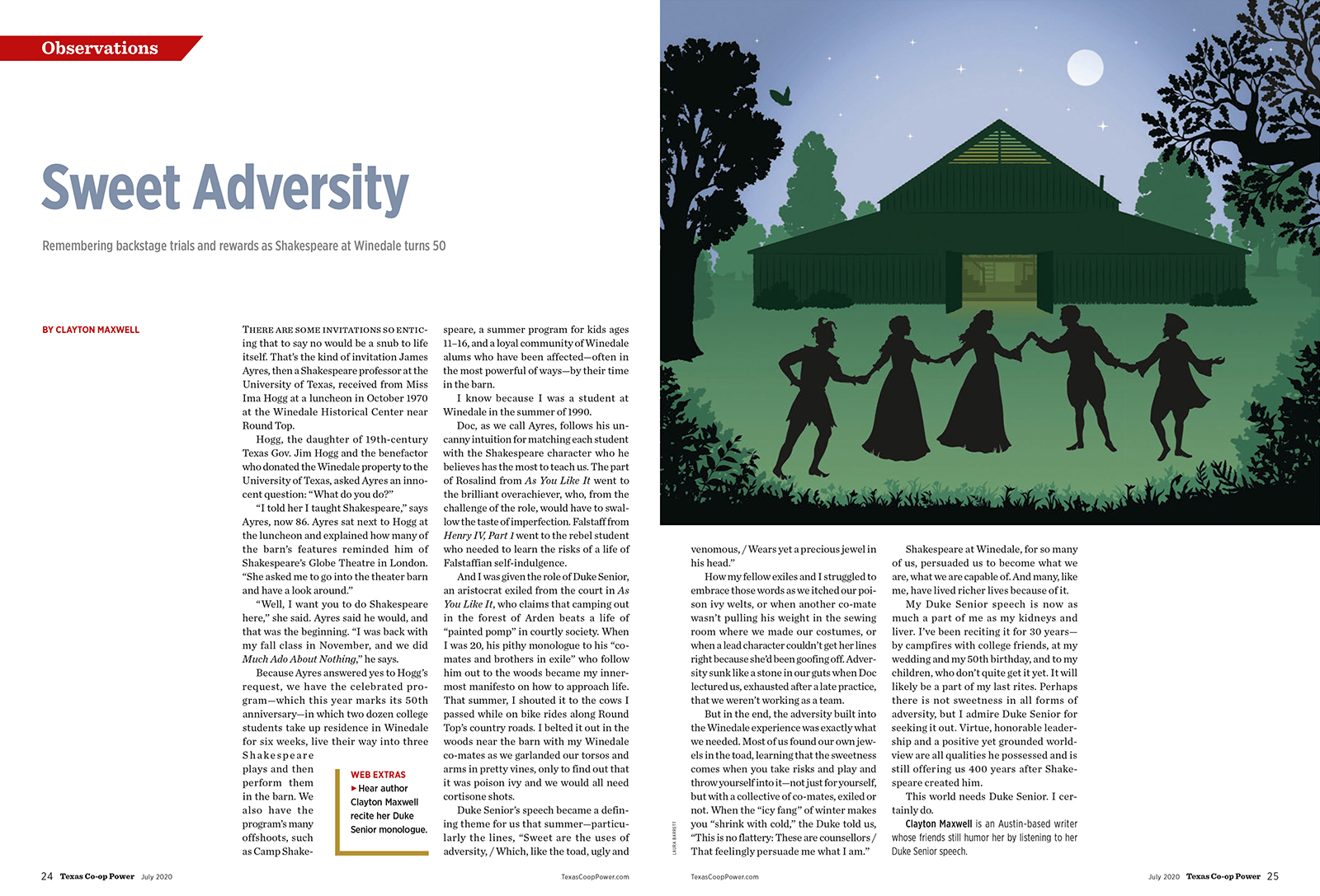 Laura Barrett was commissioned by Texas Co-op Power Magazine to create an illustration to accompany an article about a Shakespeare performance in the beautiful historic centre of Winedale, Texas, focussing on the authors memory of As you like it.