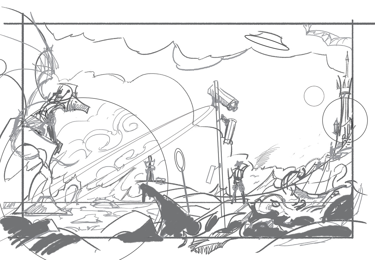 Deciding early on in the process that the composition should draw a straight line between the traveller and a tower that evokes those in the Lord of the Rings, the figure stands in for the viewer, gazing past the title, the kraken and the pirate ship and out to the horizon, following up the tower and pointed back to the traveller by the eerie yellow light of the flying saucer, bringing your eye around to start again! The clever repetition and subtle guidance allows you to focus on something you may have missed and really revel in the details of the cover.
