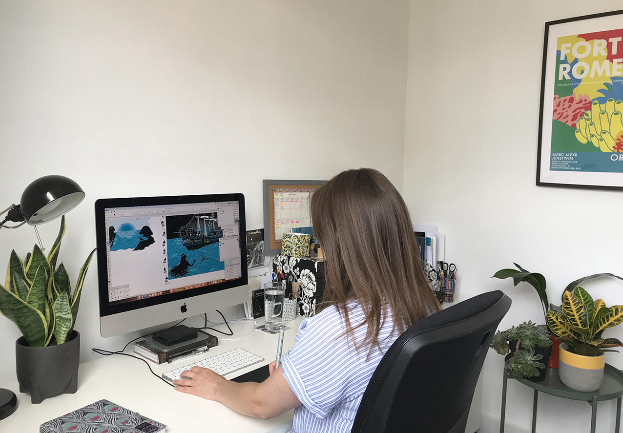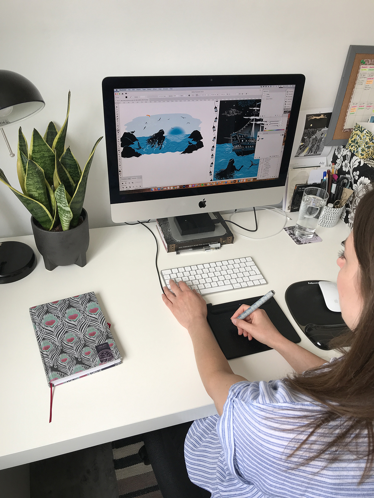 The day starts with breakfast and then yoga- I love it and it stops me from getting stiff and achey whilst being sat at my desk all day. Once I’m at my desk I’ll answer emails and package up any Etsy orders that I have first thing. I find it easier to think in the mornings so I’ll use this time to develop any projects and compositions before moving on to creating the artwork in the afternoon and early evening. I’ll pop to the Post Office at lunch time and finish the day cooking a nice meal and getting stuck into a Netflix series.