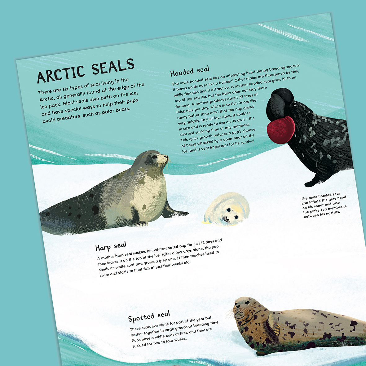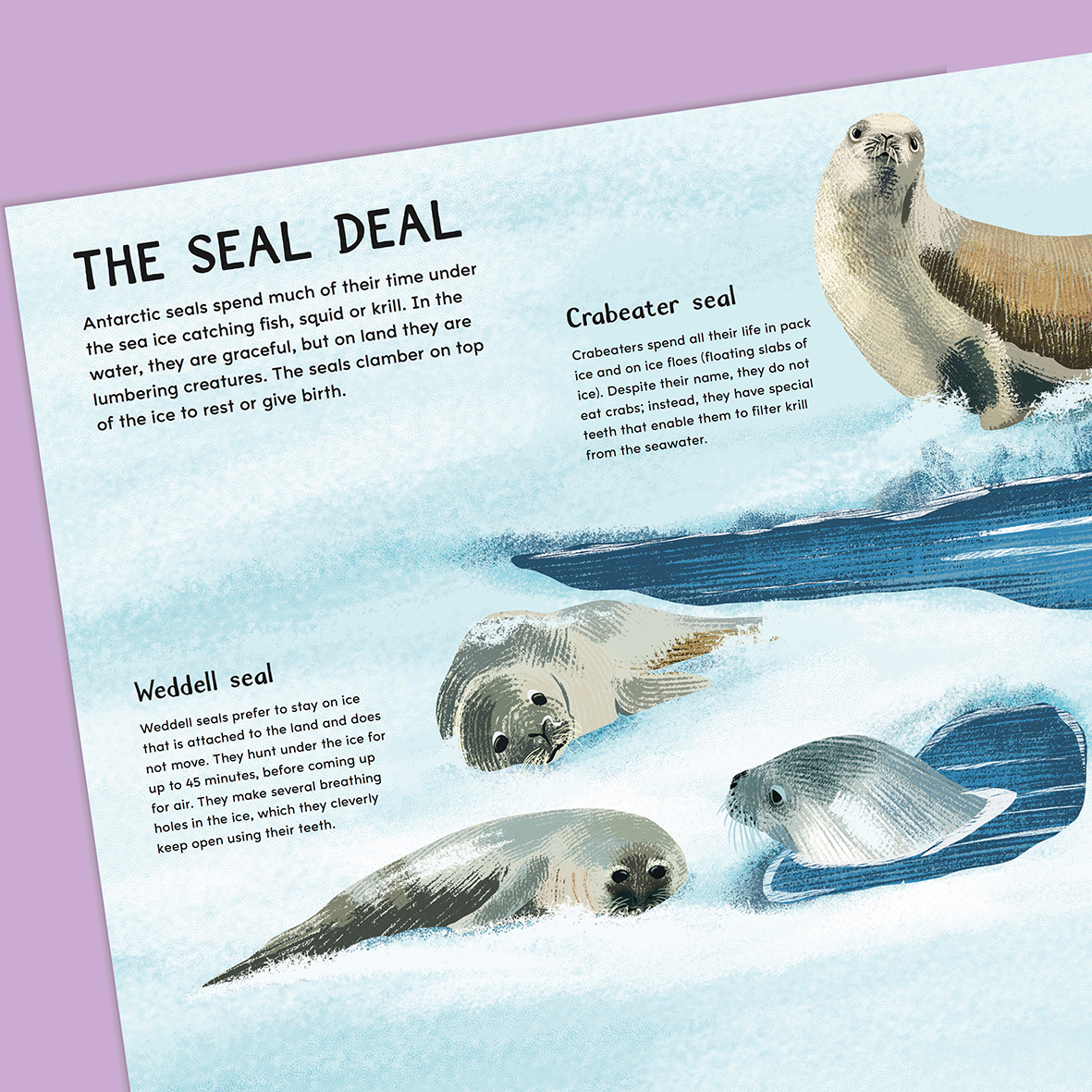 But Nic’s favourite part of the project? Besides learning more about seals and the geography of the icecaps, “what I think will always be the favourite part for me is colour, this is when time flies for me and I get lost in painting and picking colours.”