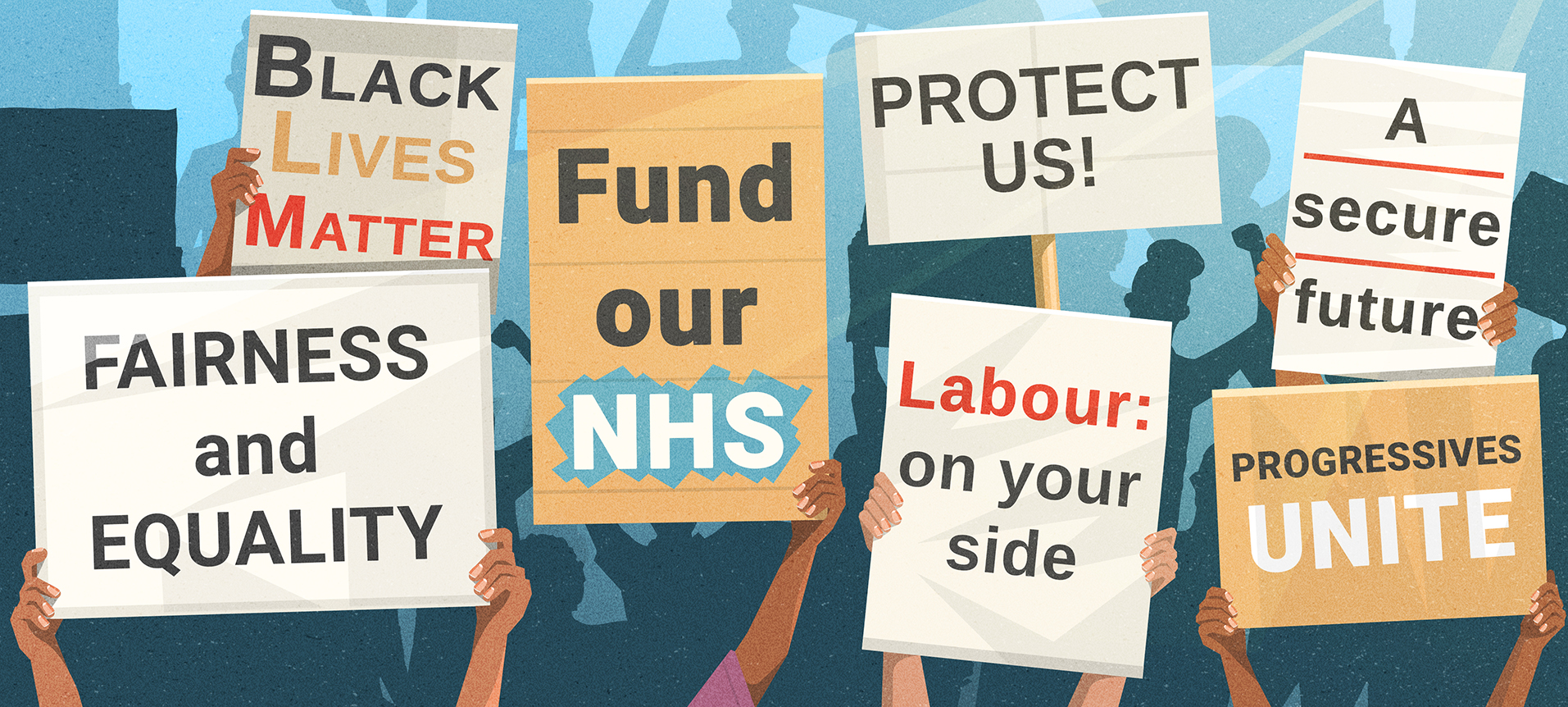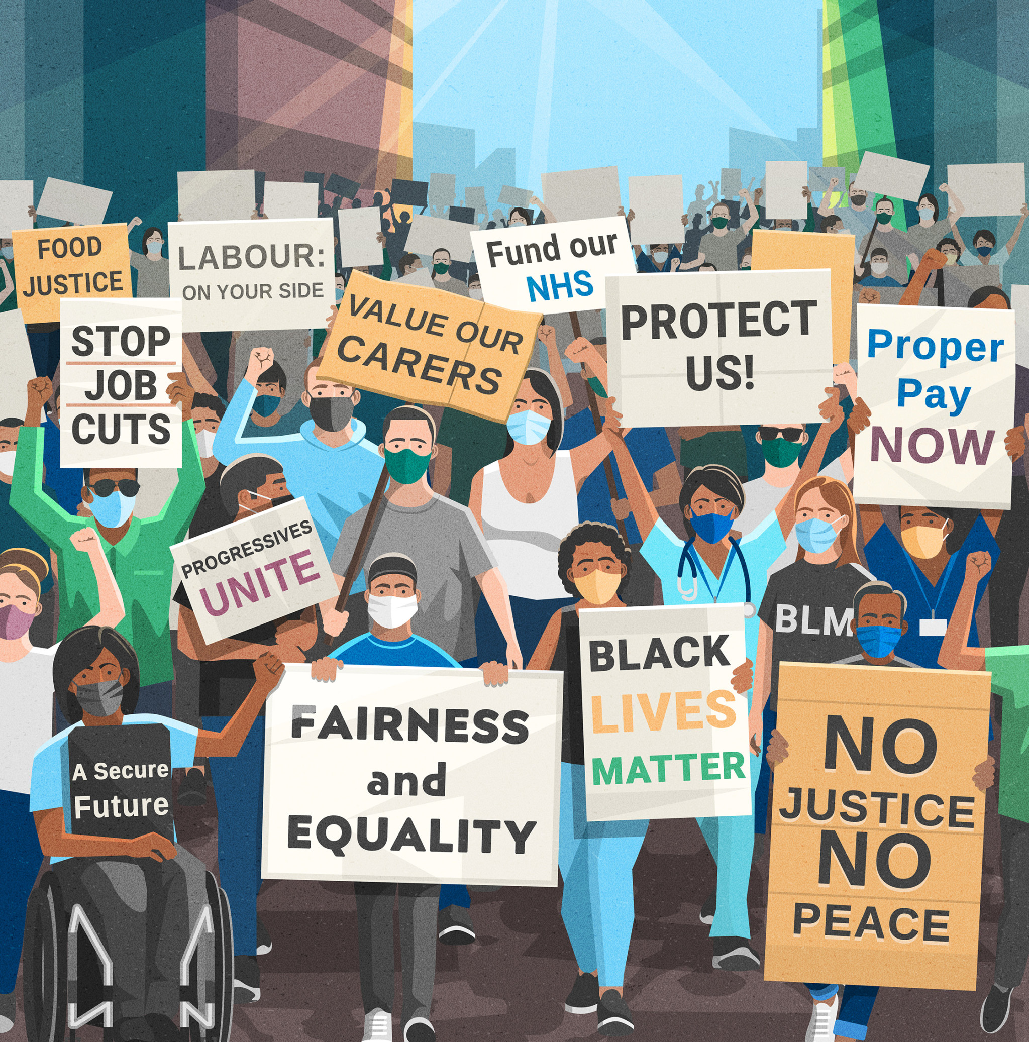 Daniel Long was commissioned by The Fabian Review to create the cover and lead illustration for their summer 2020 issue, highlighting specific issues raised by recent protests around the world regarding the coronavirus pandemic and Black Lives Matter.