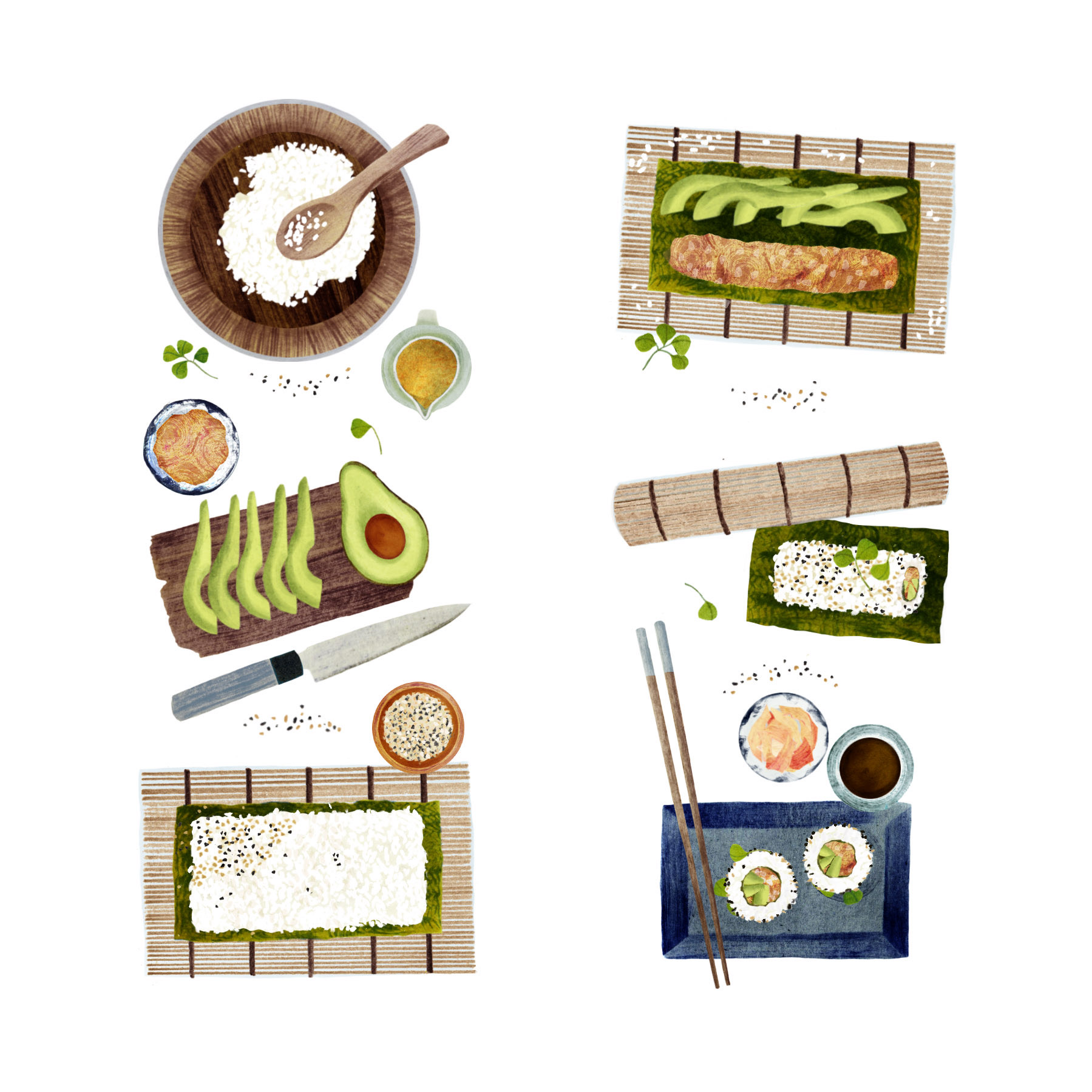 Hannah found illustrating each element of the sushi-making process every bit as satisfying as the actual thing, with so many accoutrements like the bamboo mats, dipping bowls and chopsticks to dive into the details of. Hannah’s textured brushwork perfectly differentiates the materials each utensil is made of, as well capturing the different textures of ingredients that make up a California Roll. This is definitely a dish we are eating with our eyes, and Hannah has made sure that it is delicious.