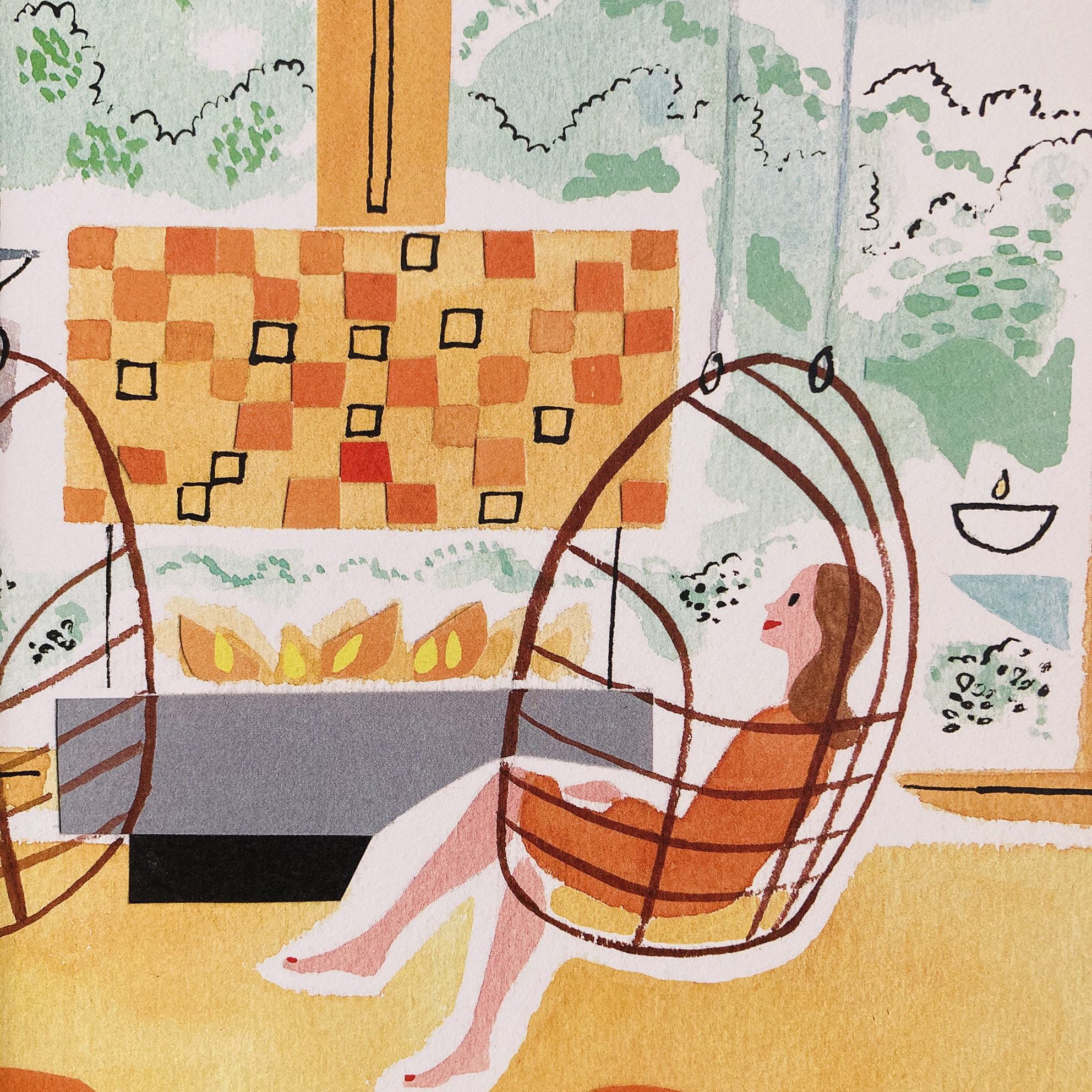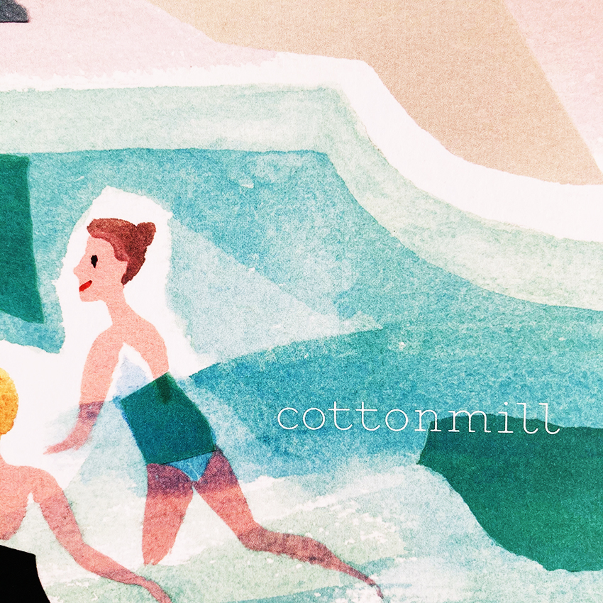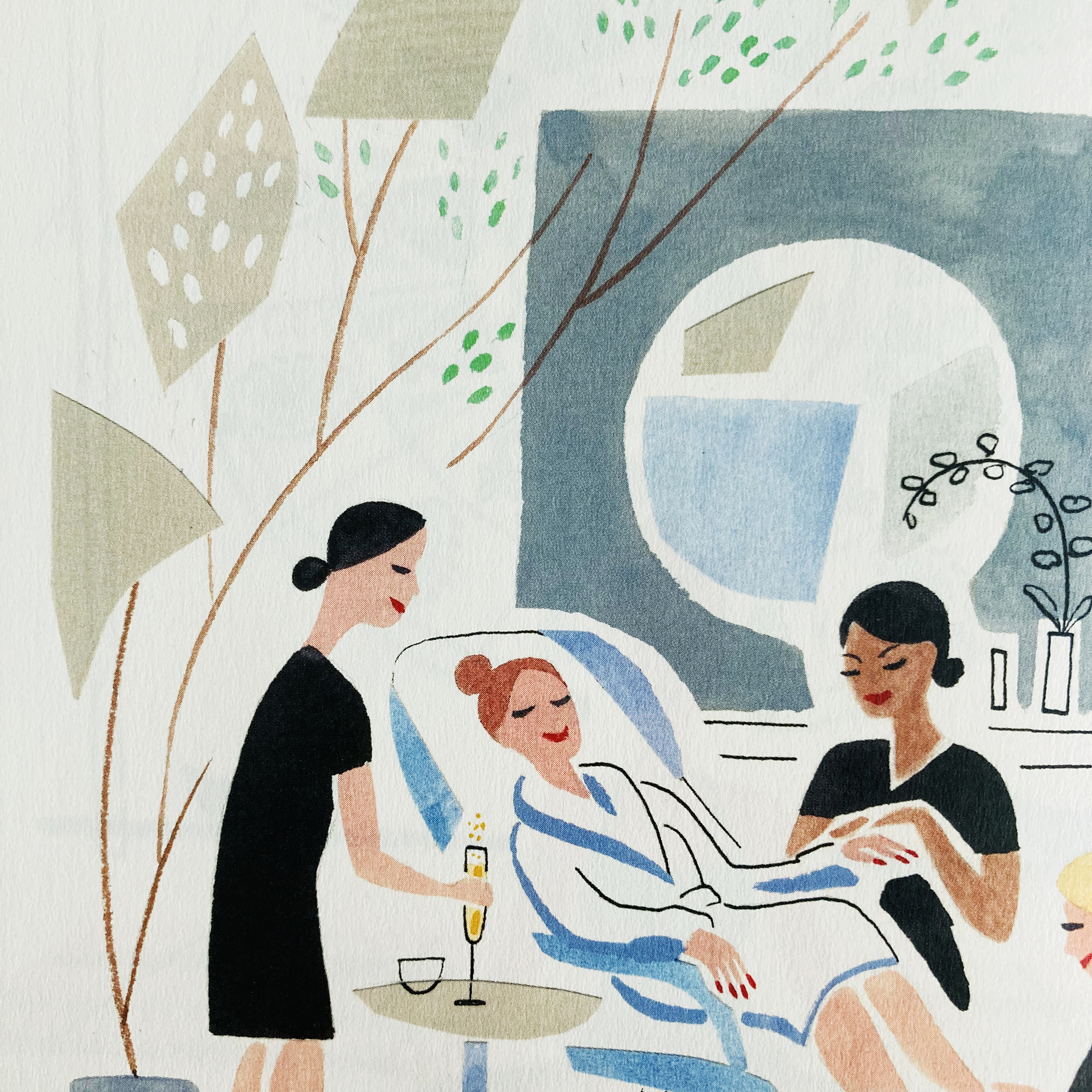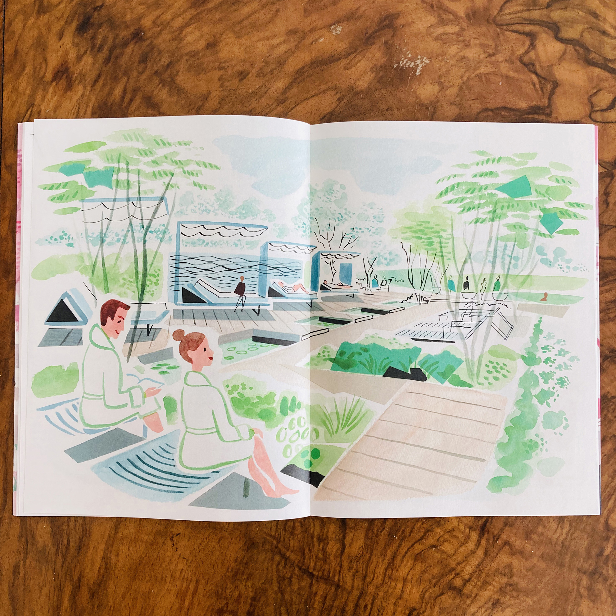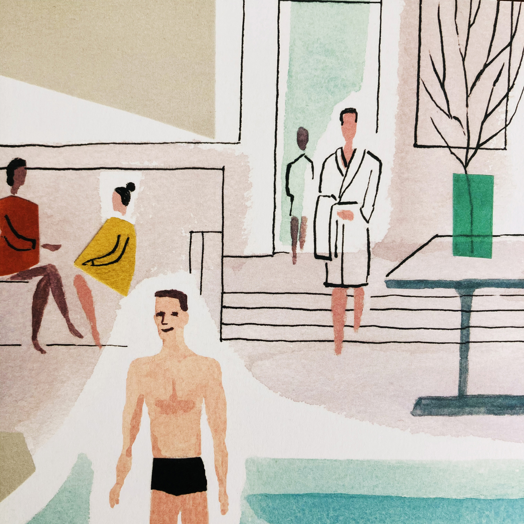 Rendered using her signature combination of gouache & ink on watercolour paper and incorporating painted elements of collage, Sarah’s sparing use of line and washes of colour bring relaxation to the forefront, with figures not bound by tense outlines and are instead allowed to settle into the scenery of the spa.