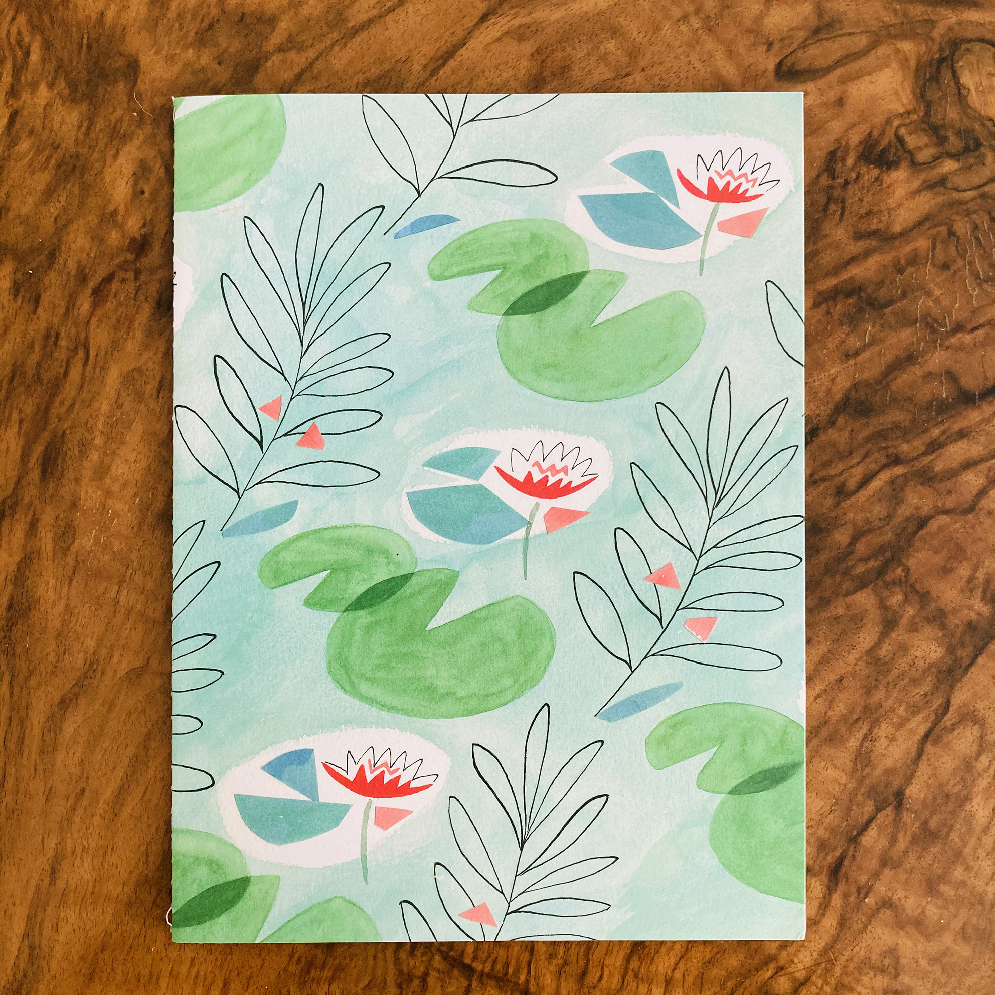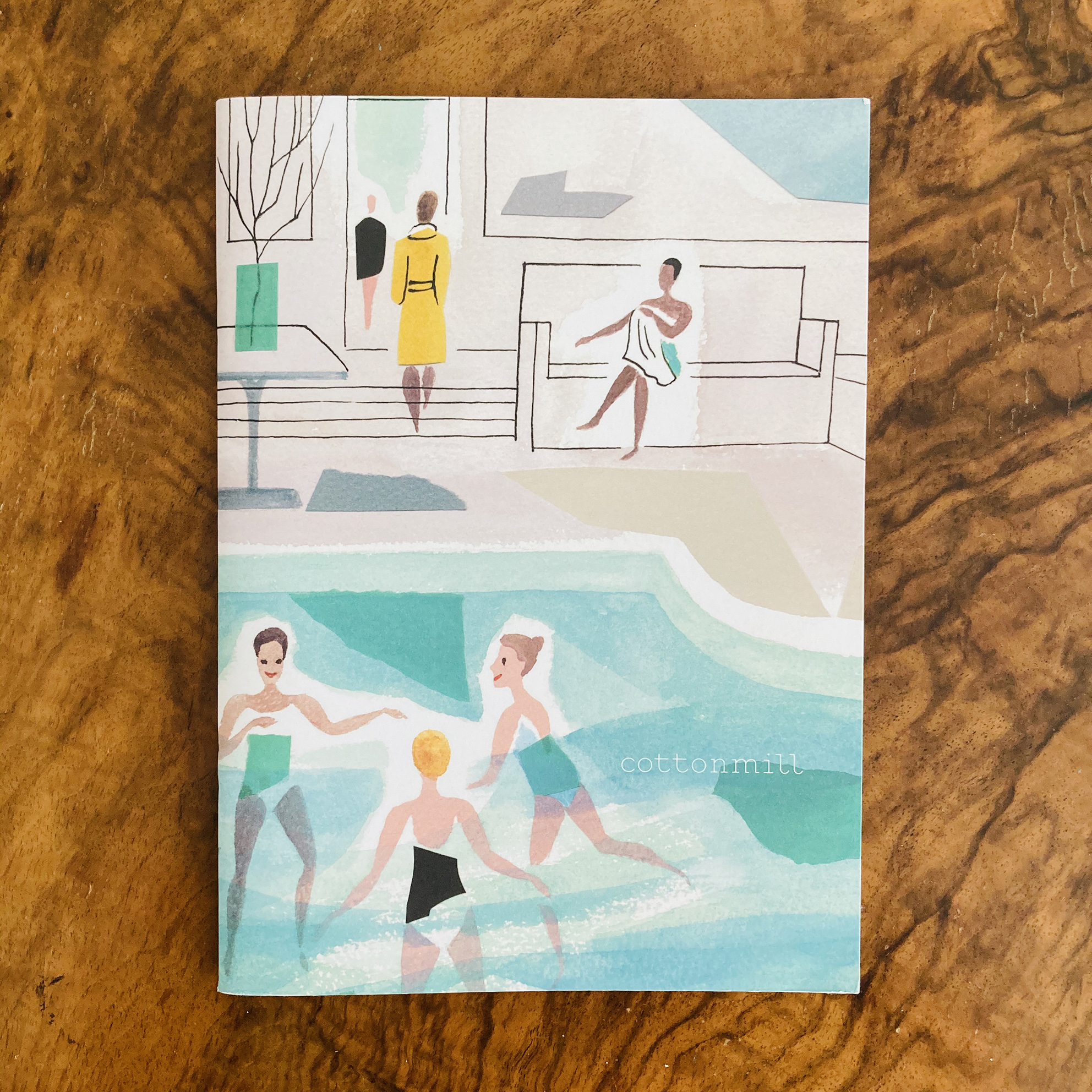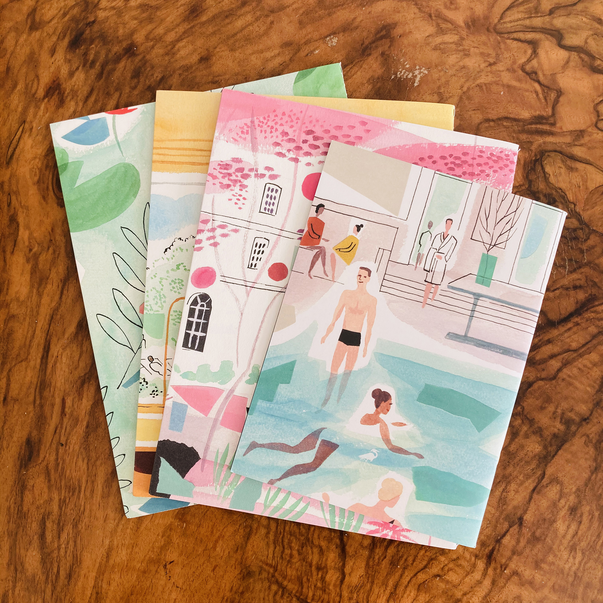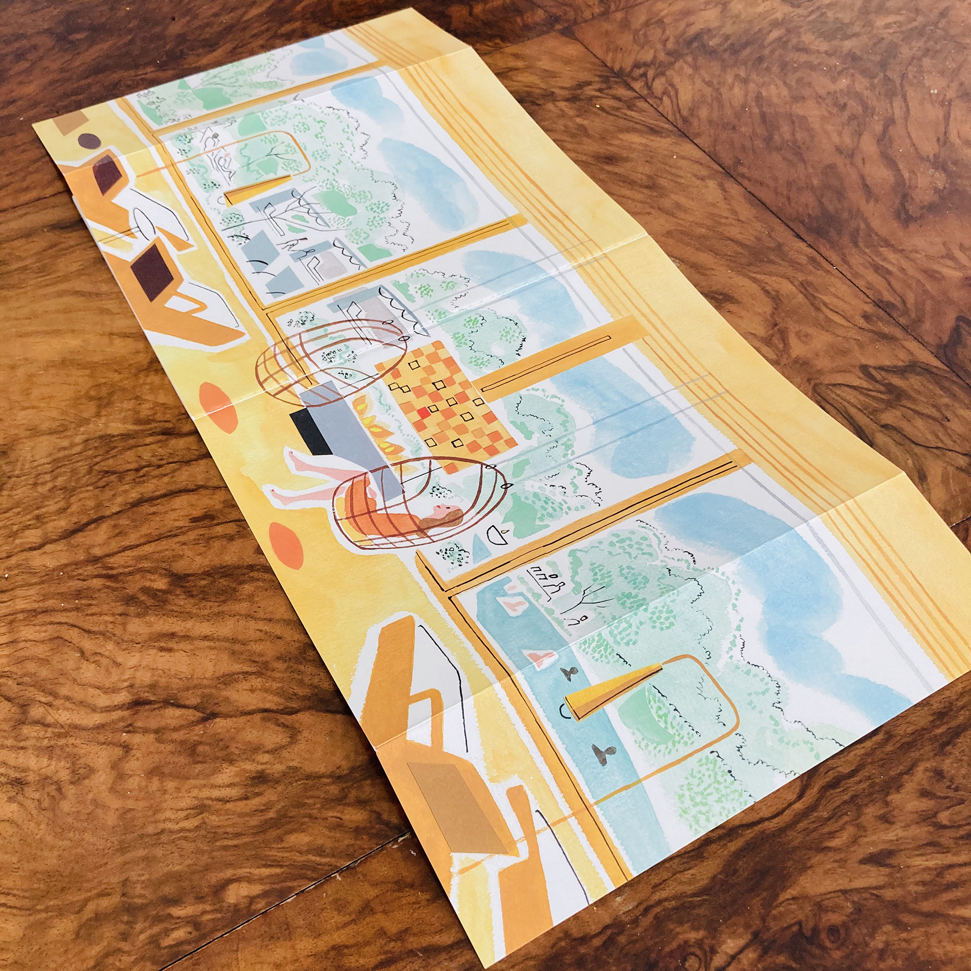 Rendered using her signature combination of gouache & ink on watercolour paper and incorporating painted elements of collage, Sarah’s sparing use of line and washes of colour bring relaxation to the forefront, with figures not bound by tense outlines and are instead allowed to settle into the scenery of the spa.