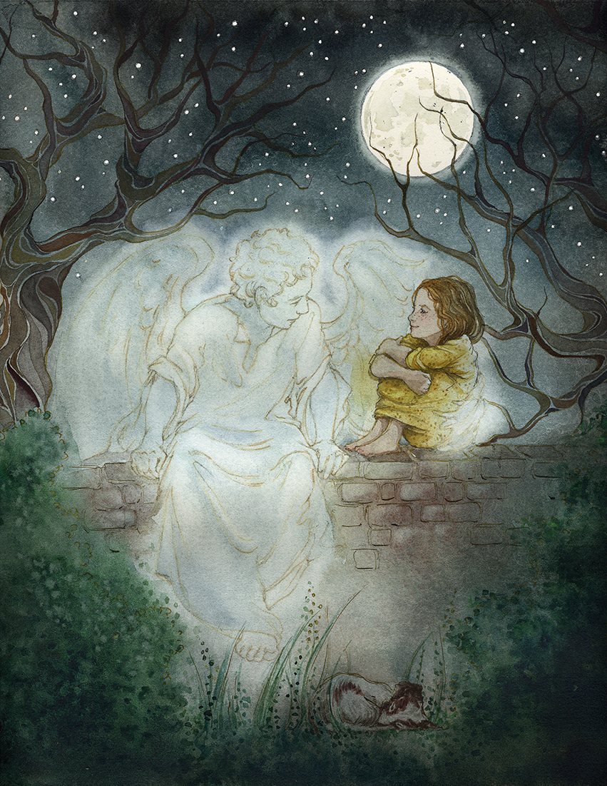 Wanting to mirror the light touch that Maggie uses with her words to relay a darker subject, Daniela’s fragile pencil lines and watercolour washes bring the ethereal nature of the angel to the foreground, while creating a perfect winter atmosphere. Wanting the characters to be as relatable as possible, Daniela made sure to use real life inspiration;