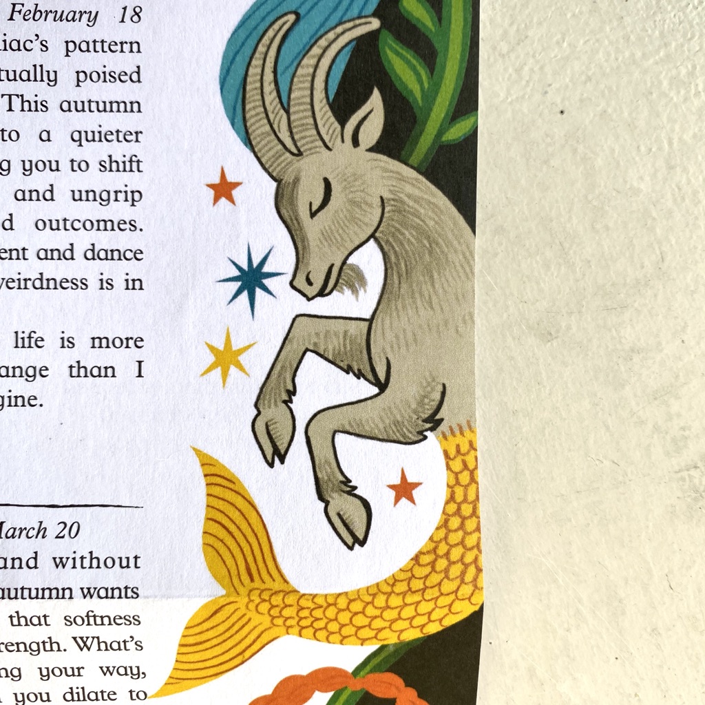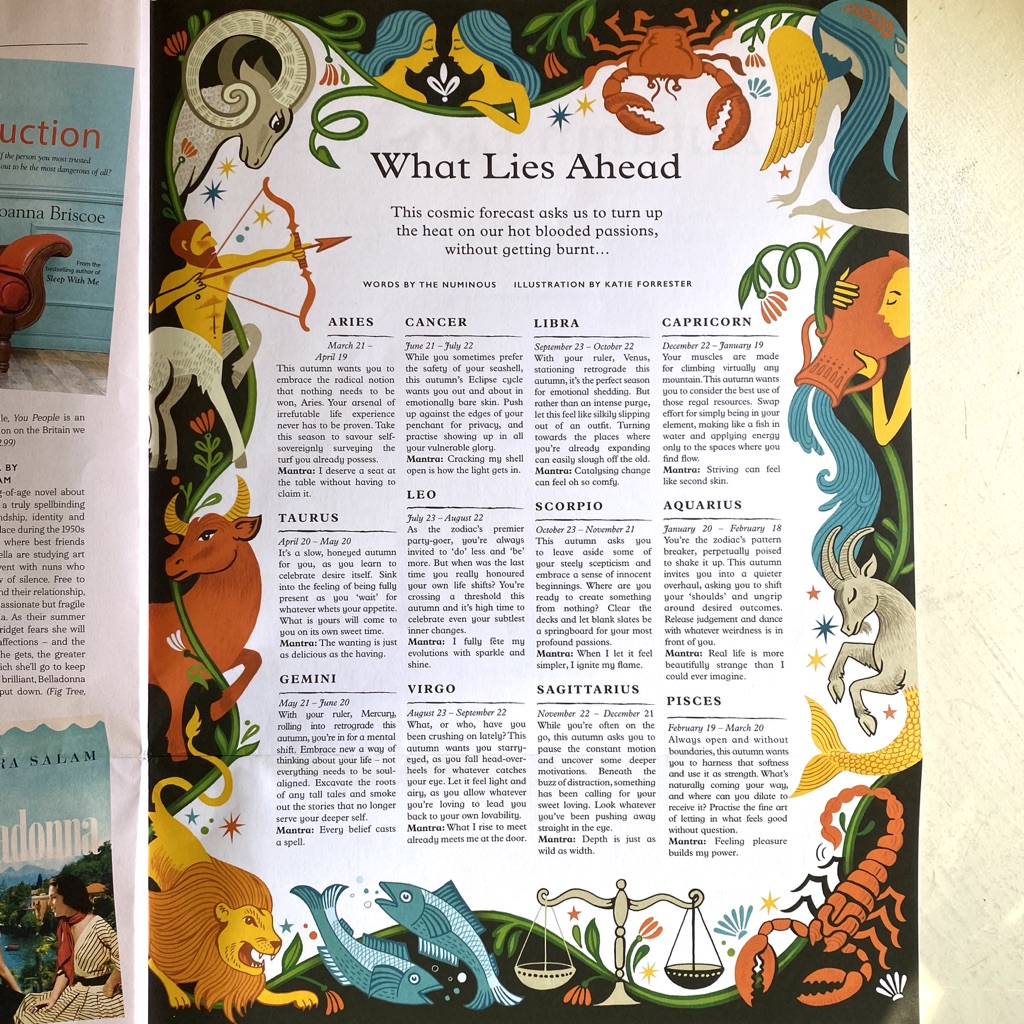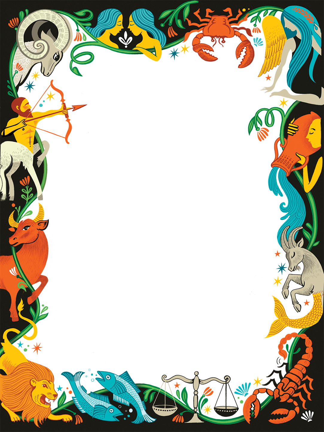 Kate Forrester has created a colourful original border to surround the horoscope section of The Ned, putting her own distinctive twist on the classic star signs.