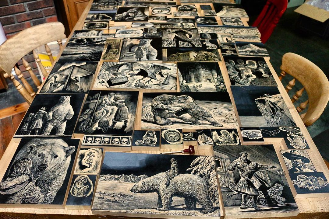 Chris Wormell is busy working away on the new illustrated editions of Phillip Pullman’s “His Dark Materials” trilogy, with “The Northern Lights” released in November. Chris has been giving eager fans a glimpse into his illustration process for the second book “The Subtle Knife”, showing off sketches and inked blocks of some of the iconic scenes.