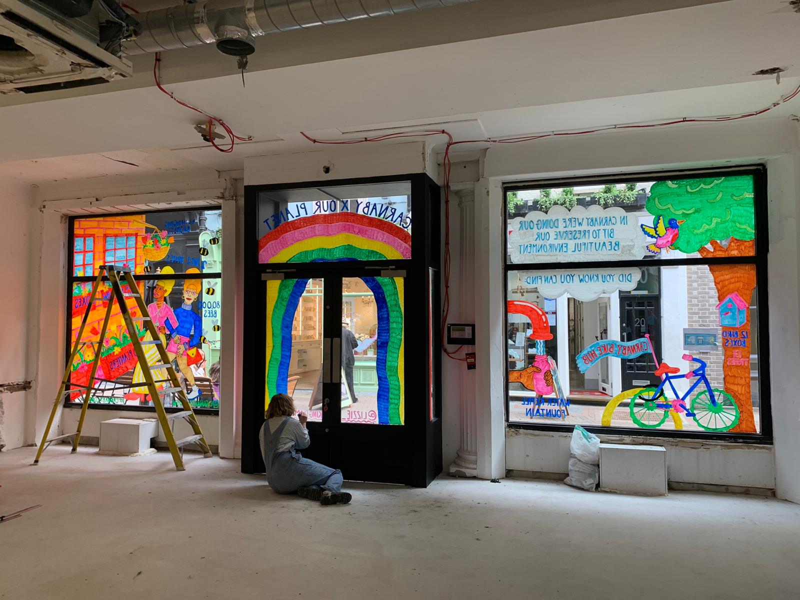 Armed with Posca’s and her ladder, Lizzie’s window drawings are a celebration of all things eco in and around the area that the general public might not be aware of, like 2 beehives and 80’000 bees or 12 bird boxes across 13 trees for example!