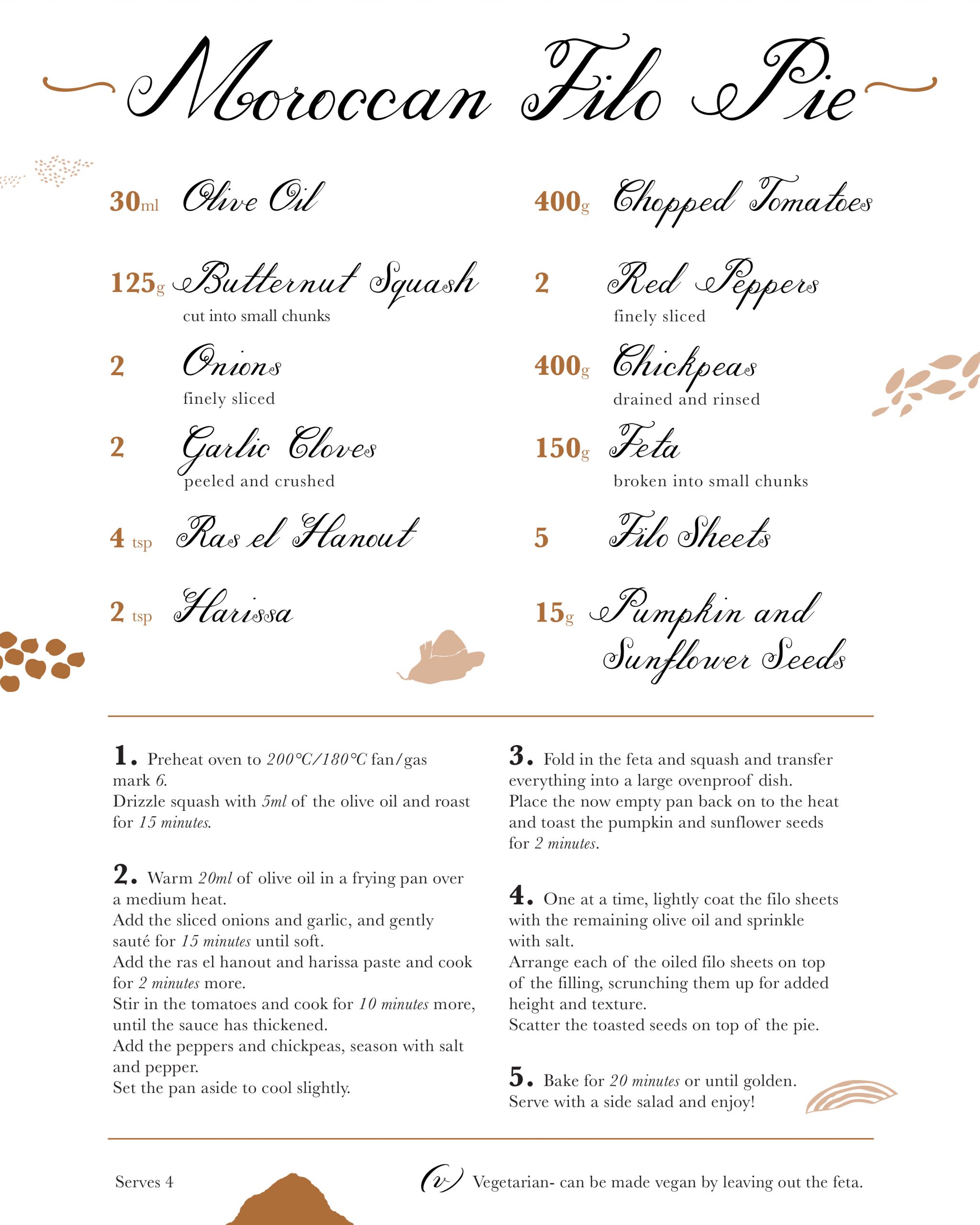 We’re back with another recipe from one of our culinary inclined creatives; Laura Barrett is impressing with a Moroccan inspired filo pie!