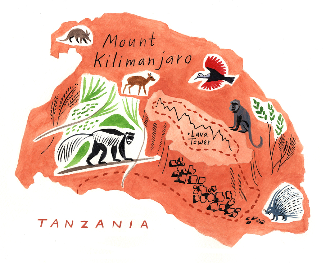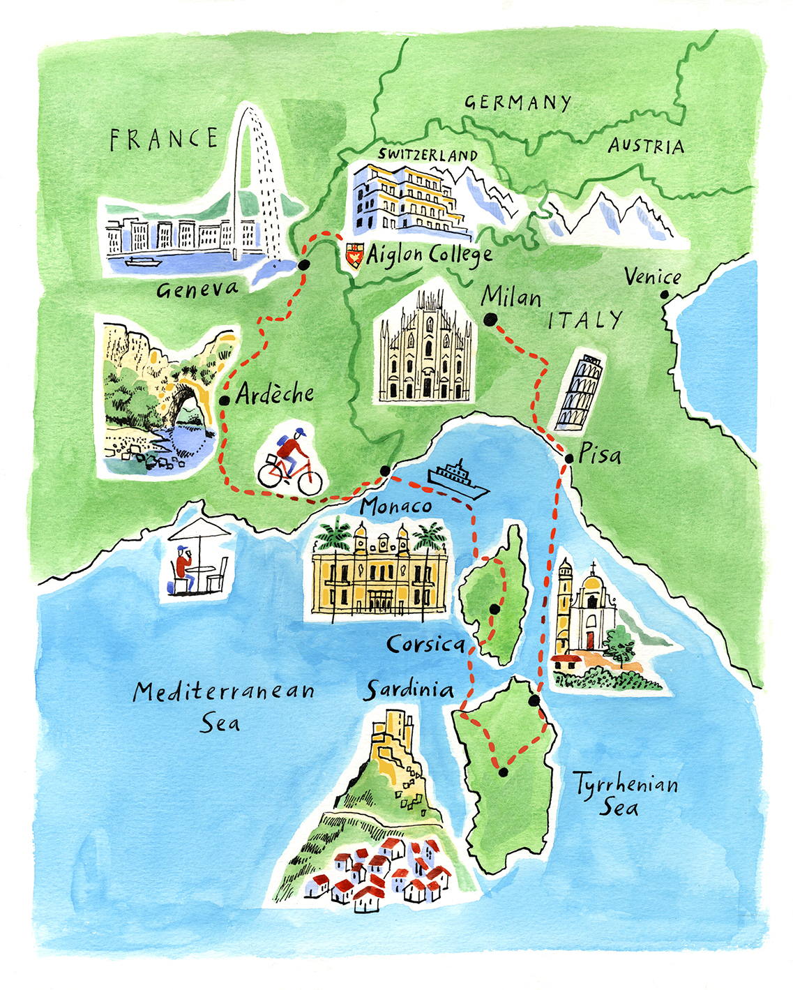 Sarah McMenemy has contributed three maps to Swiss boarding school’s Aiglon College’s campus magazine, illustrating the adventurous journeys undertaken by students; bicycle journey from Switzerland to Milan via Corsica, trekking round a national park in Thailand and ascending Mt. Kilimanjiro.