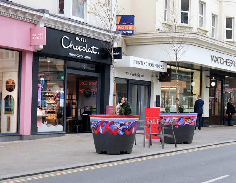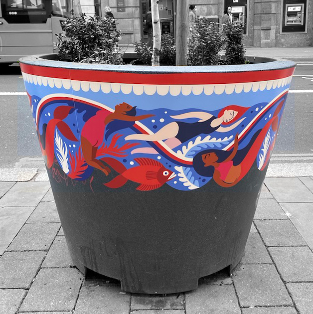 The artworks were hand drawn and digitally coloured, then printed onto vinyl to be wrapped around the planters, working in one continuous loop around each pot. Kate’s pots and the trail as a whole add a real sense of vibrancy to the city during the greyer months, “this project was special to me as it represents our city and the collective will in our community to recover from this difficult time we have experienced since the pandemic. I cant wait to attend future events in this program – ironically I missed the first one this month because I had covid!!”
