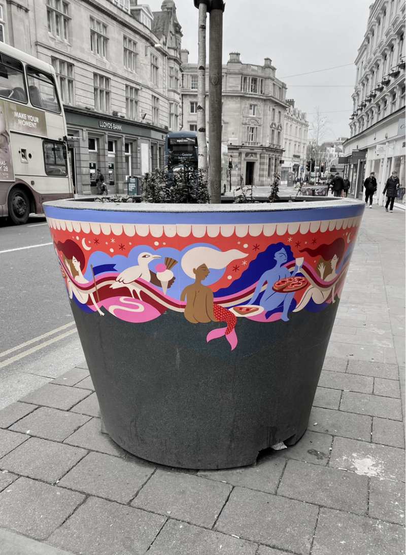 Decorating planters along one of the busiest roads in Brighton, Kate’s illustrations are part of a larger art trail that spreads across walls, bus stops, lampposts and street furniture to coincide with cultural and music events.