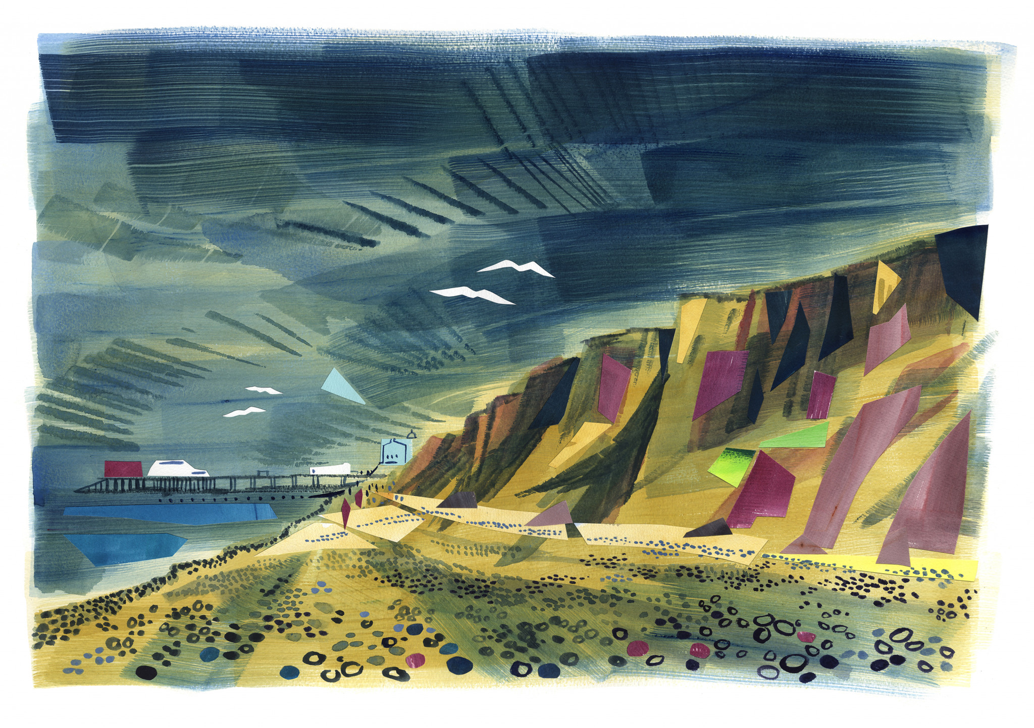 Each painting is made up of collaged elements and washes of colour, acting as fantastic representations of the windswept coastline and the waves amongst landmarks like Cromer Pier and East Runton Cliffs.