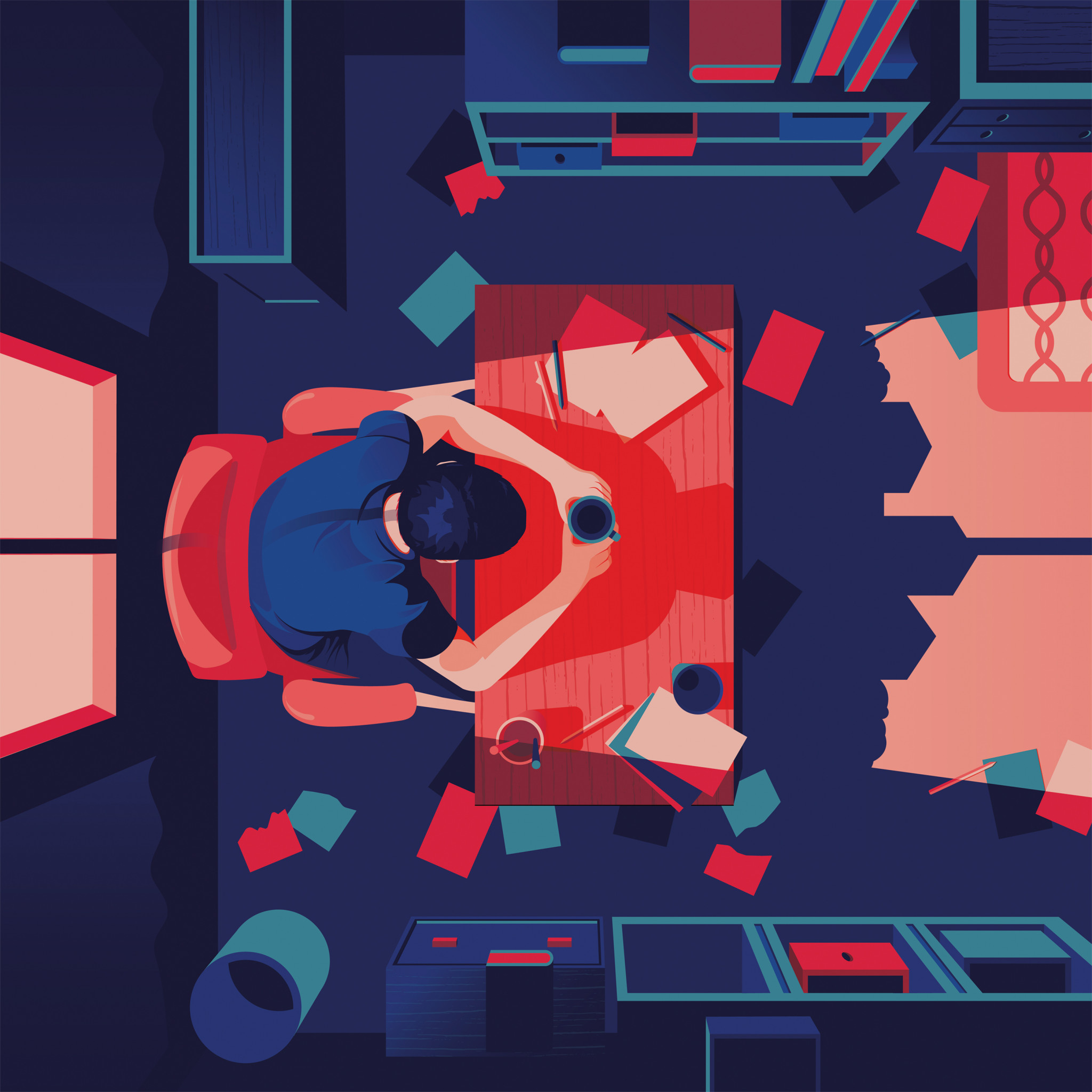 Creating the entire piece using Adobe Illustrator which allowed for quick explorations of colour before deciding on the final palette. The most enjoyable part of the project was adding in the tiny details such as the pencils on the desk, the pattern on the carpet and the wood grain on the furniture.