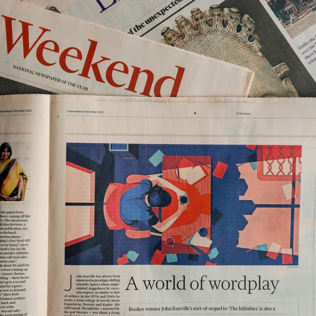 Katie was asked to create an image for the FT Weekend Arts and Culture section, capturing the interweaving narratives about life, death and even quantum theory present in John Banville’s Booker prize-winning novel ‘The Singularities’.