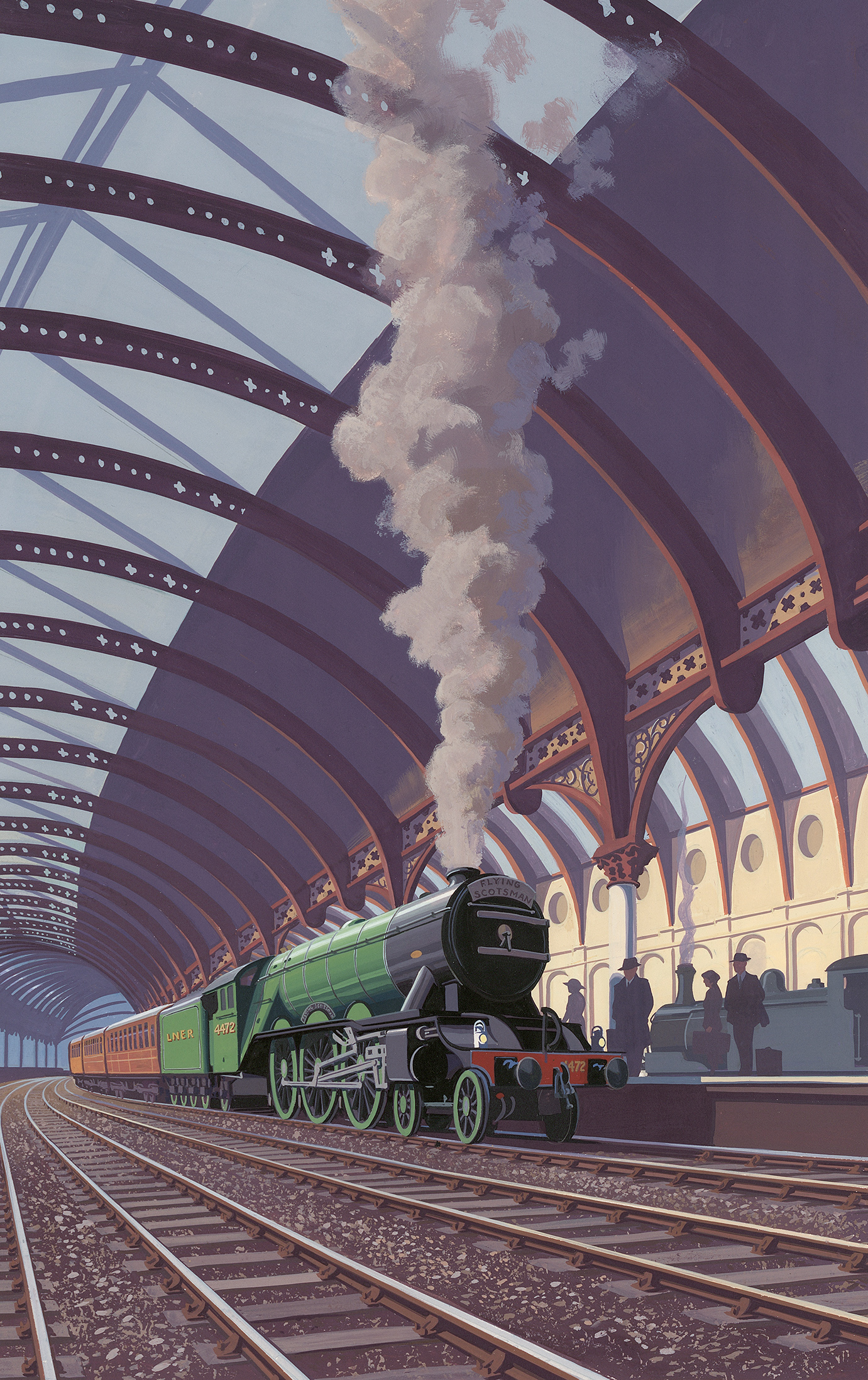 The biggest challenge, apart from drawing in perspective the curved tracks and roof structures, was to combine accuracy, always a requirement when illustrating any form of historical transport, without destroying the spirit and drama of this world famous Locomotive.