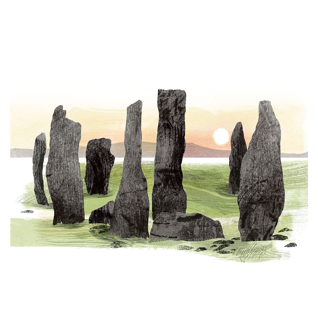 I loved working on the illustrations of the stone circle’s (Stonehenge, Avebury and the Calanais standing stones are all illustrated in the book), there is something about the large stone verticals cutting into the horizontal landscape that works so well in a composition.